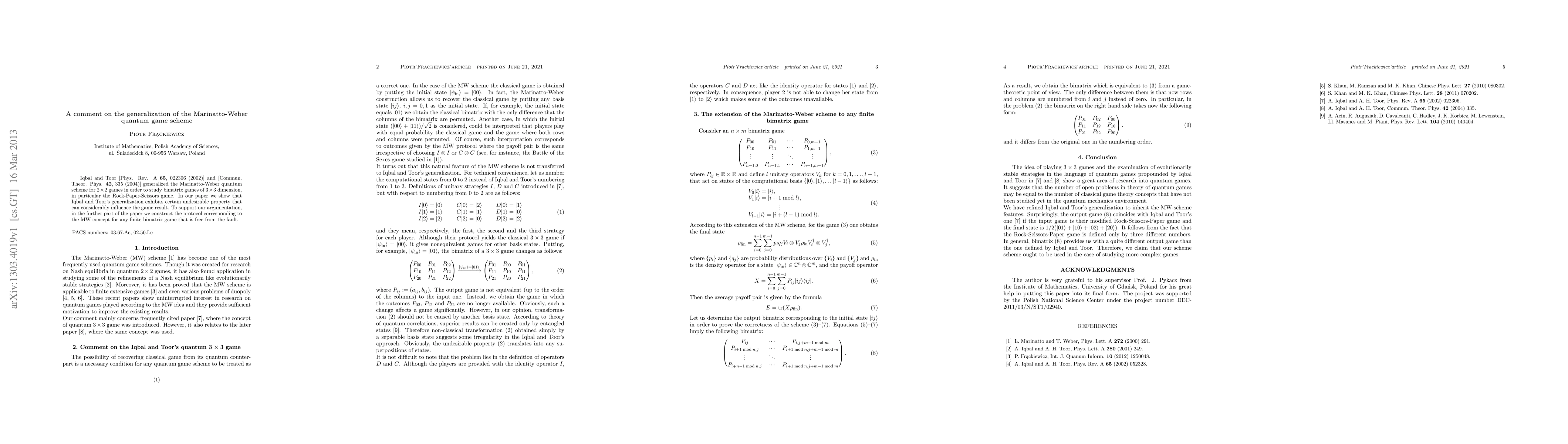 Iqbal and Toor [Phys. Rev. A {\bf 65}, 022306 (2002)] and [Commun. Theor. Phys. {\bf 42}, 335 (2004)] generalized the Marinatto-Weber quantum scheme for $2 \times 2$ games in order to study bimatrix games of $3 \times 3$ dimension, in particular the Rock-Paper-Scissors game. In our paper we show that Iqbal and Toor's generalization exhibits certain undesirable property that can considerably influence the game result. To support our argumentation, in the further part of the paper we construct the protocol corresponding to the MW concept for any finite bimatrix game that is free from the fault.