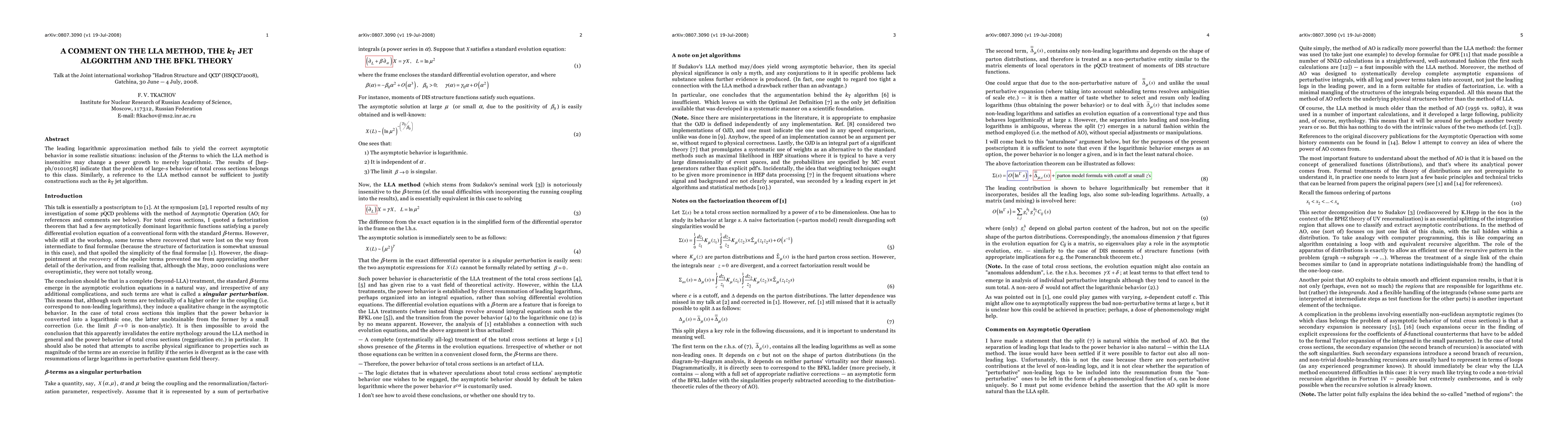 The LLA method's limitations were highlighted in this paper, showing it fails to yield correct asymptotic behavior under certain conditions, particularly when beta-terms are included. This challenges the kT jet algorithm and other constructions based on the LLA method.