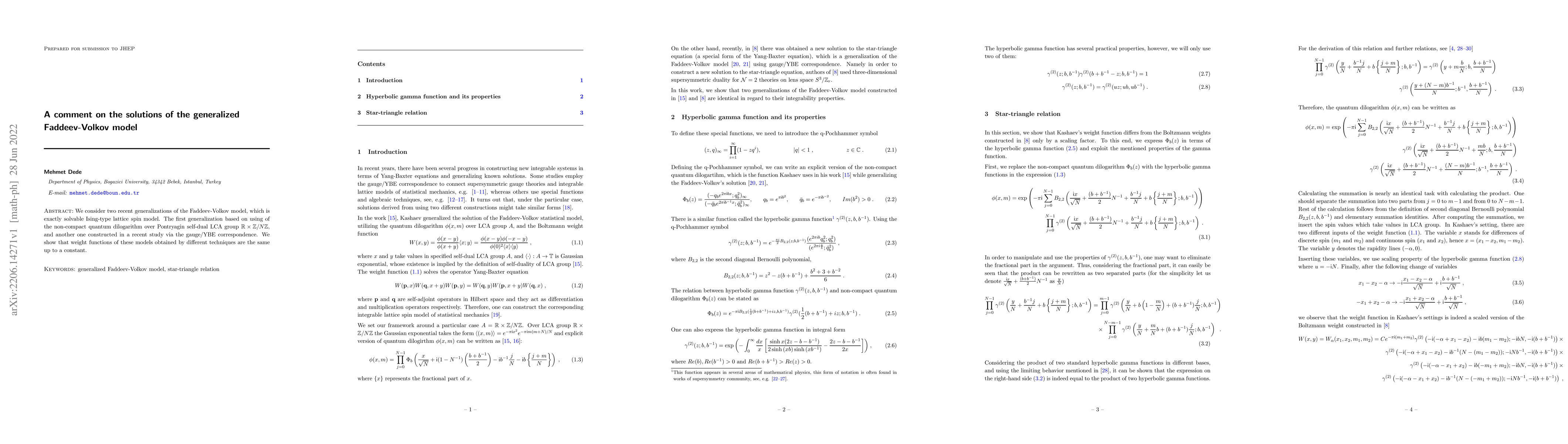 Summary: This paper examines two generalized versions of the Faddeev-Volkov model, revealing that despite different construction methods—one using non-compact quantum dilogarithm and the other via gauge/YBE correspondence—the weight functions derived are equivalent up to a constant factor.