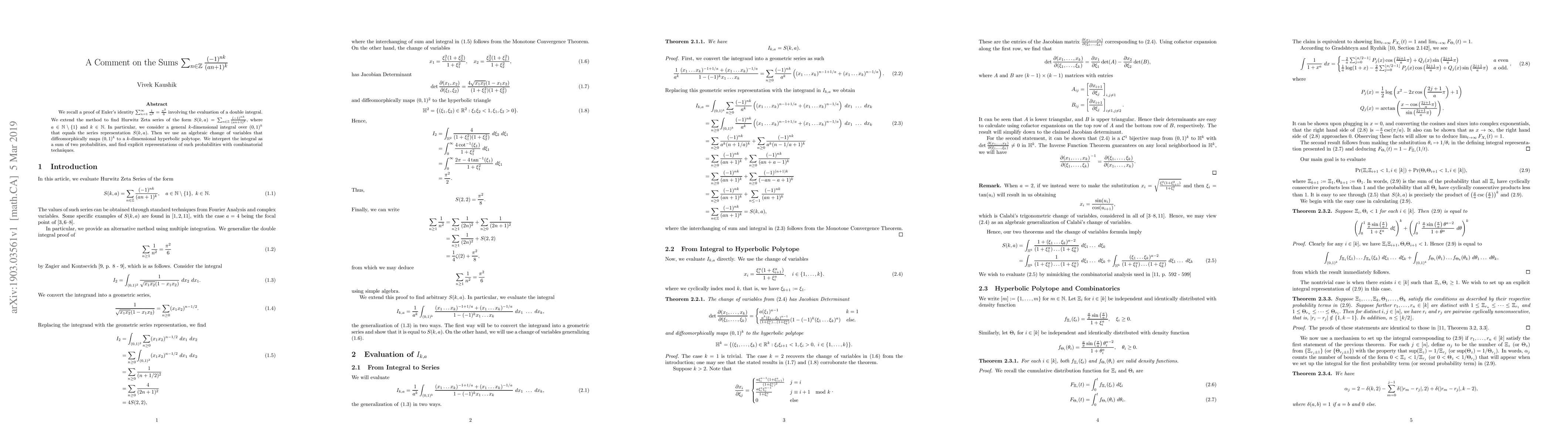 We recall a proof of Euler's identity $\sum_{n=1}^{\infty} \frac{1}{n^2}=\frac{\pi^2}{6}$ involving the evaluation of a double integral. We extend the method to find Hurwitz Zeta series of the form $S(k,a)=\sum_{n \in \mathbb{Z}} \frac{(-1)^{nk}}{(an+1)^k},$ where $a \in \mathbb{N} \setminus \lbrace 1 \rbrace$ and $k \in \mathbb{N}.$ In particular, we consider a general $k$-dimensional integral over $(0,1)^k$ that equals the series representation $S(k,a).$ Then we use an algebraic change of variables that diffeomorphically maps $(0,1)^k$ to a $k$-dimensional hyperbolic polytope. We interpret the integral as a sum of two probabilities, and find explicit representations of such probabilities with combinatorial techniques.