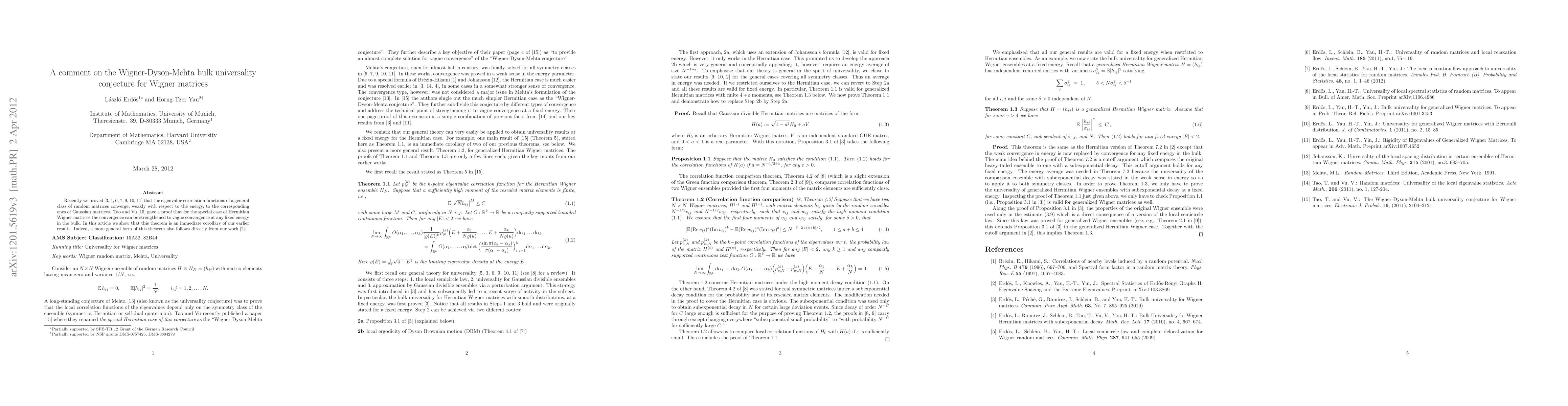 Recently we proved (EPRSY, ERSTVY, ESY4, ESYY, EYY, EYY2, EYYrigi) that the eigenvalue correlation functions of a general class of random matrices converge, weakly with respect to the energy, to the corresponding ones of Gaussian matrices. Tao and Vu \cite{TV5} gave a proof that for the special case of Hermitian Wigner matrices the convergence can be strengthened to vague convergence at any fixed energy in the bulk. In this article we show that this theorem is an immediate corollary of our earlier results. Indeed, a more general form of this theorem also follows directly from our work \cite{EKYY2}.