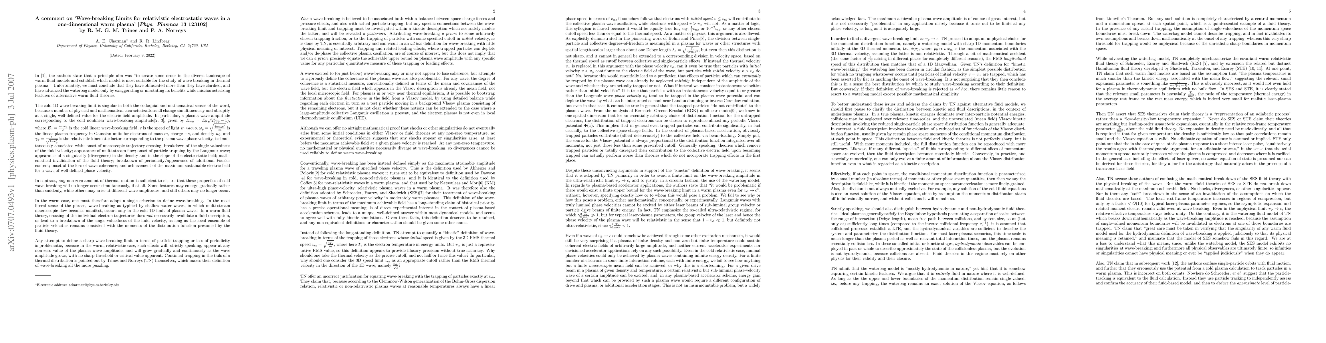 Trines and Norreys state that a principle aim of their work on warm wave-breaking was ``to create some order in the diverse landscape of warm fluid models and establish which model is most suitable for the study of wave breaking in thermal plasma.'' Unfortunately, we must conclude that they have obfuscated more than they have clarified, and have advanced the waterbag model only by exaggerating or misstating its benefits while mischaracterizing features of alternative warm fluid theories.