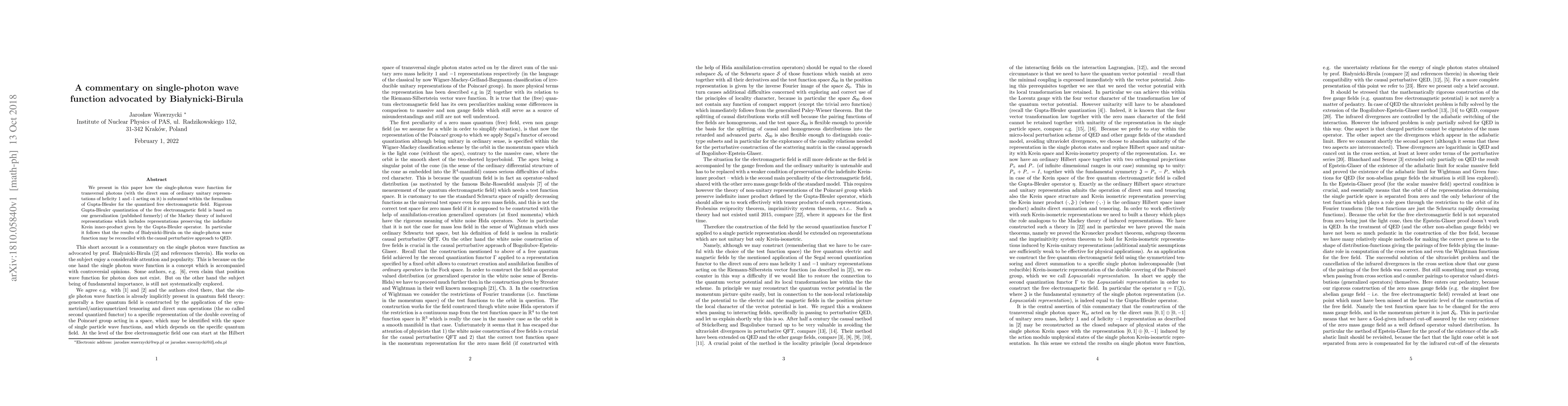 We present in this paper how the single-photon wave function for transversal photons (with the direct sum of ordinary unitary representations of helicity 1 and -1 acting on it) is subsumed within the formalism of Gupta-Bleuler for the quantized free electromagnetic field. Rigorous Gupta-Bleuler quantization of the free electromagnetic field is based on our generalization (published formerly) of the Mackey theory of induced representations which includes representations preserving the indefinite Krein inner-product given by the Gupta-Bleuler operator. In particular it follows that the results of Bia{\l}ynicki-Birula on the single-photon wave function may be reconciled with the causal perturbative approach to QED.