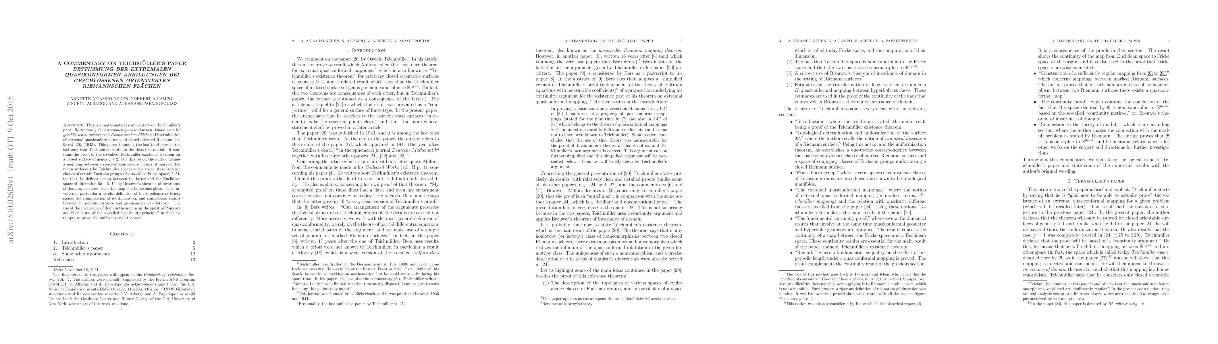 This is a mathematical commentary on Teichm{\"u}ller's paper ``Bestimmung der extremalen quasikonformen Abbildungen bei geschlossenen orientierten Riemannschen Fl{\"a}chen'' (Determination of extremal quasiconformal maps of closed oriented Riemann surfaces). This paper is among the last (and may be the last one) that Teichm{\"u}ller wrote on the theory of moduli. It contains the proof of the so-called Teichm{\"u}ller existence theorem for a closed surface of genus at least 2. For this proof, the author defines a mapping between a space of equivalence classes of marked Riemann surfaces (the Teichm{\"u}ller space) and a space of equivalence classes of certain Fuchsian groups (the so-called Fricke space). After that, he defines a map between the latter and the Euclidean space of dimension 6g-6 Using Brouwer's theorem of invariance of domain, he shows that this map is a homeomorphism. This involves in particular a careful definition of the topologies of Fricke space, the computation of its dimension, and comparison results between hyperbolic distance and quasiconformal dilatation. The use of the invariance of domain theorem is in the spirit of Poincar{\'e} and Klein's use of the so-called ``continuity principle'' in their attempts to prove the uniformization theorem.