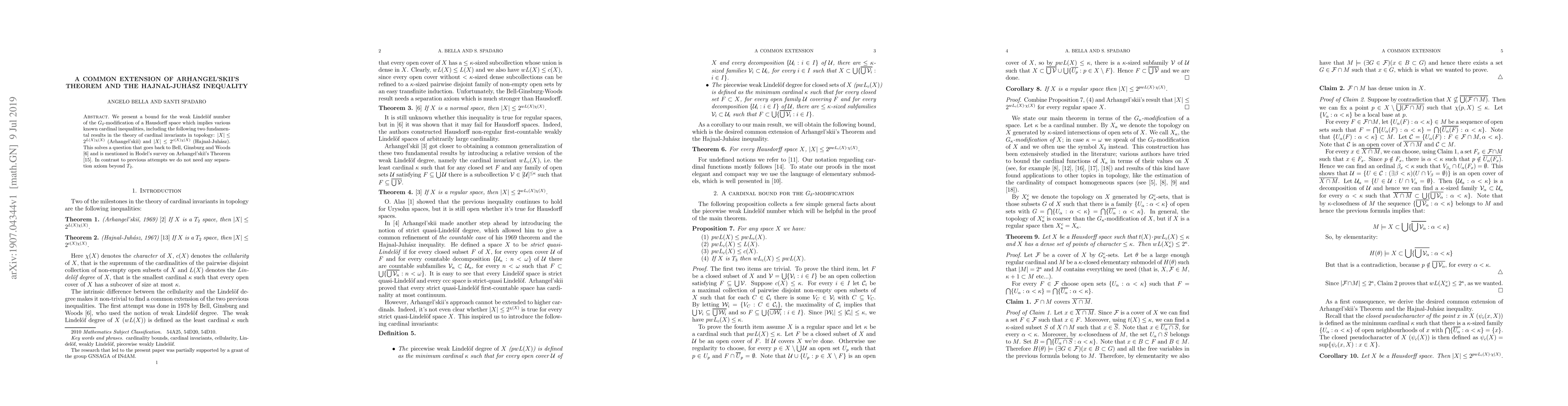 We present a bound for the weak Lindel\"of number of the $G_\delta$-modification of a Hausdorff space which implies various known cardinal inequalities, including the following two fundamental results in the theory of cardinal invariants in topology: $|X|\le 2^{L(X)\chi(X)}$ (Arhangel'skii) and $|X|\le 2^{c(X)\chi (X)}$ (Hajnal-Juhasz). This solves a question that goes back to Bell, Ginsburg and Woods and is mentioned in Hodel's survey on Arhangel'skii's Theorem. In contrast to previous attempts we do not need any separation axiom beyond $T_2$.
