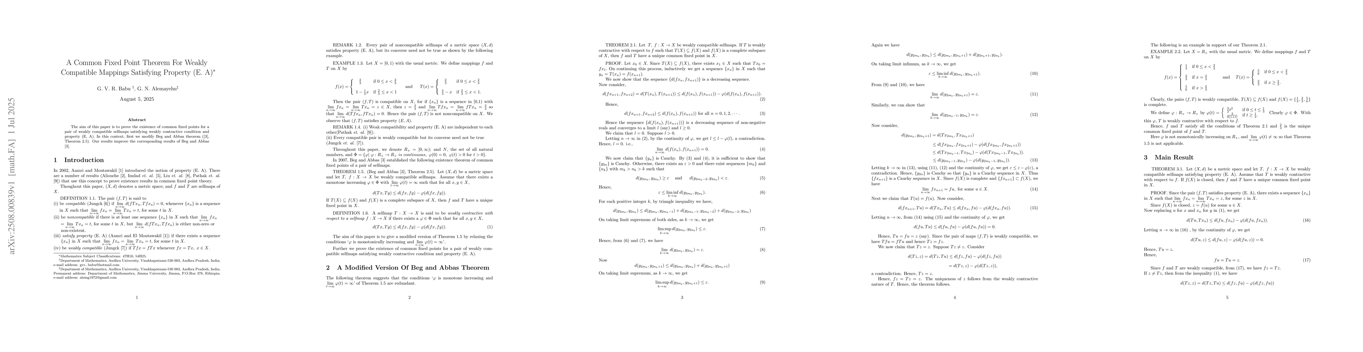 This paper proves the existence of common fixed points for pairs of specific self-mapping functions using a modified version of Beg and Abbas' theorem. The functions satisfy weak compatibility, a weakly contractive condition, and property (E. A), improving previous results in the field.