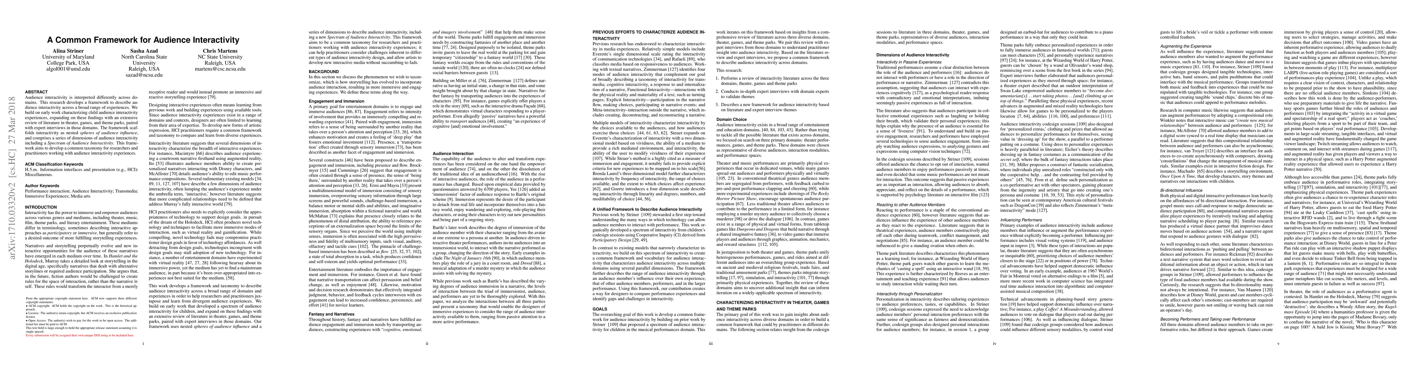 This research proposes a comprehensive framework to describe audience interactivity across various domains, including theater, games, and theme parks, based on literature review and expert interviews. The framework presents interactivity as nested spheres of influence, aiming to create a common taxonomy for researchers and practitioners.