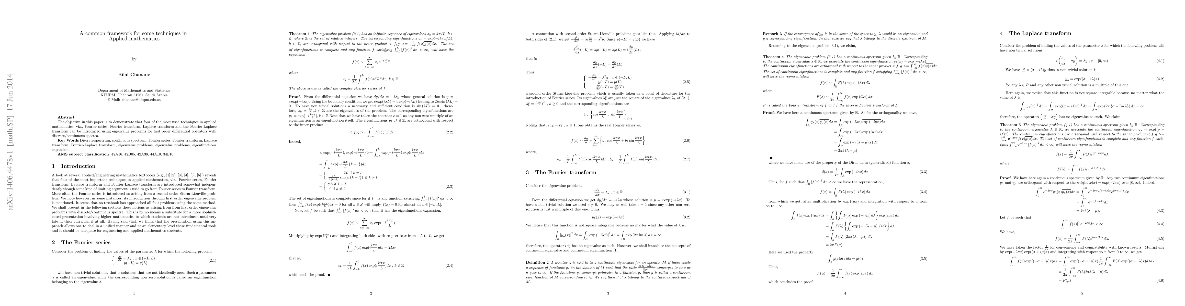 The objective in this paper is to demonstrate that four of the most used techniques in applied mathematics, viz., Fourier series, Fourier transform, Laplace transform and the Fourier-Laplace transform can be introduced using eigenvalue problems for first order differential operators with discrete/continuous spectra.