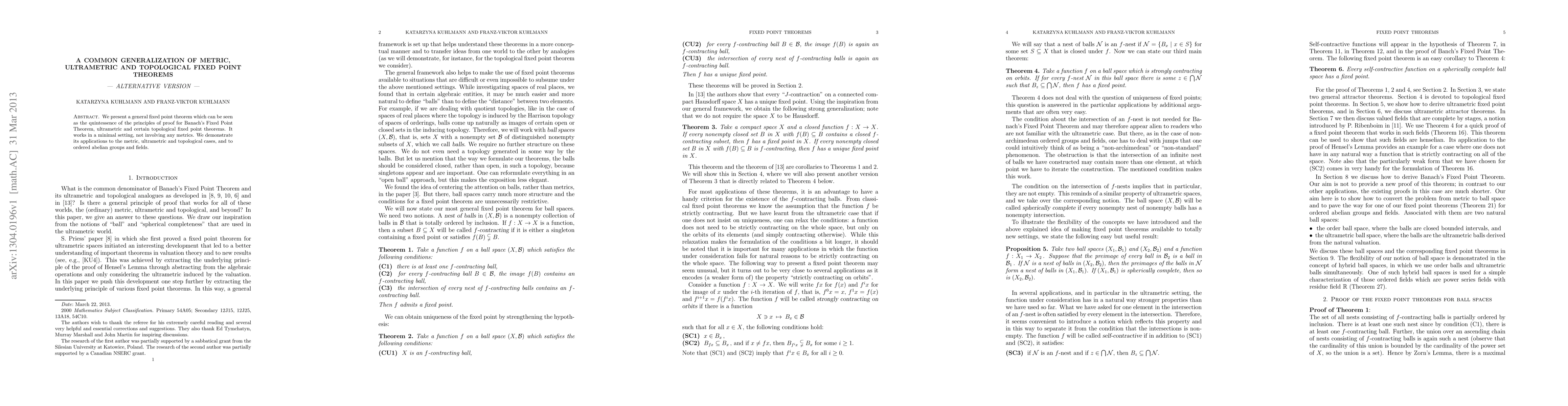 We present a general fixed point theorem which can be seen as the quintessence of the principles of proof for Banach's Fixed Point Theorem, ultrametric and certain topological fixed point theorems. It works in a minimal setting, not involving any metrics. We demonstrate its applications to the metric, ultrametric and topological cases, and to ordered abelian groups and fields.