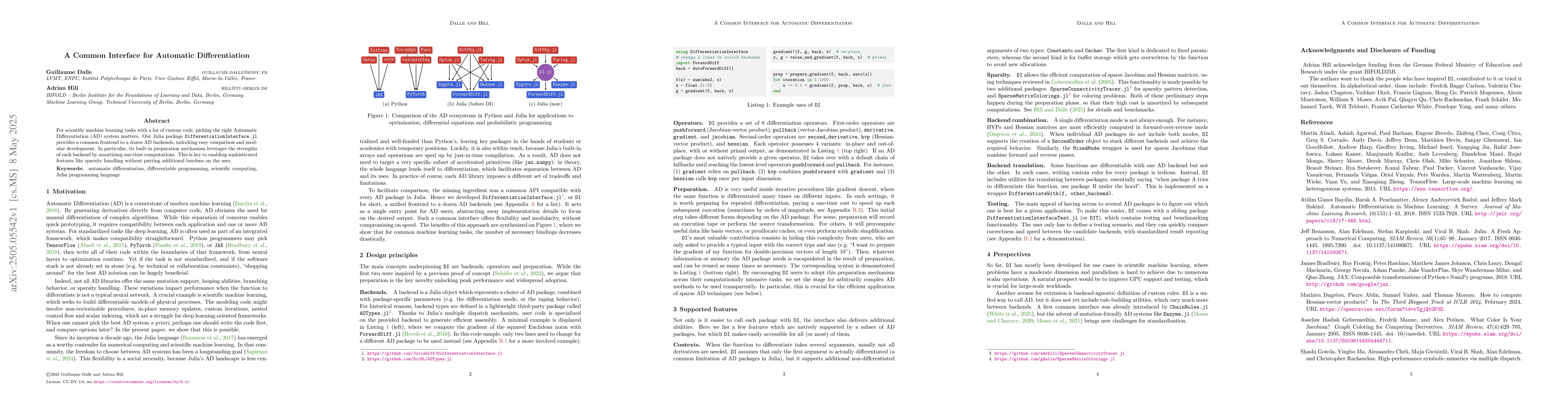 A Julia package provides a common interface for various Automatic Differentiation backends, allowing easy comparison and modular development for scientific machine learning tasks.