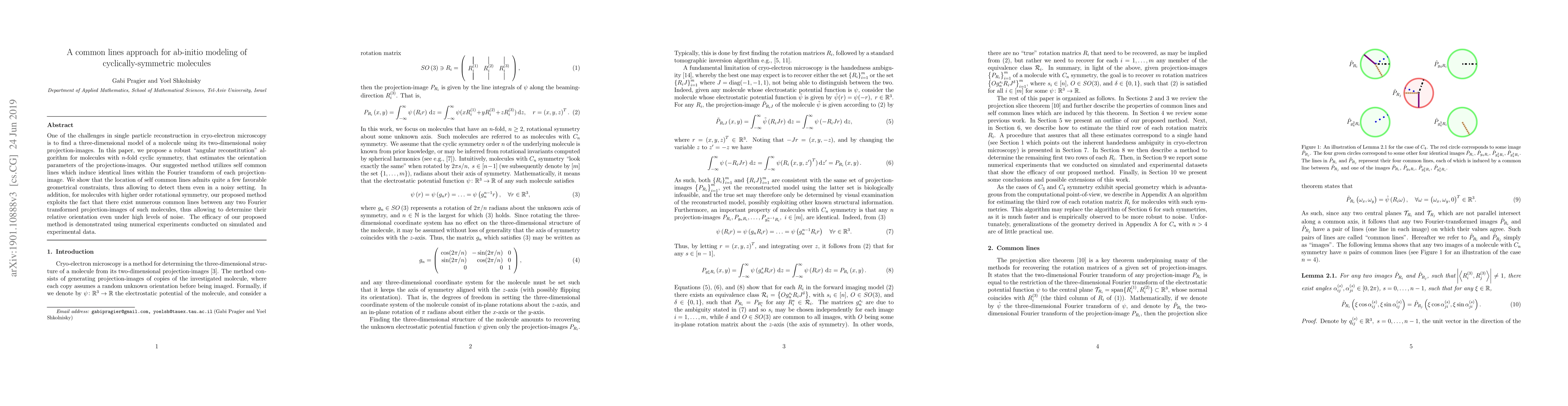 This paper proposes a robust "angular reconstitution" algorithm for reconstructing three-dimensional models of cyclically symmetric molecules from noisy two-dimensional cryo-electron microscopy images, leveraging self common lines in Fourier transform to detect orientation parameters. The method is shown to be effective even under high noise levels through numerical experiments on both simulated and experimental data.