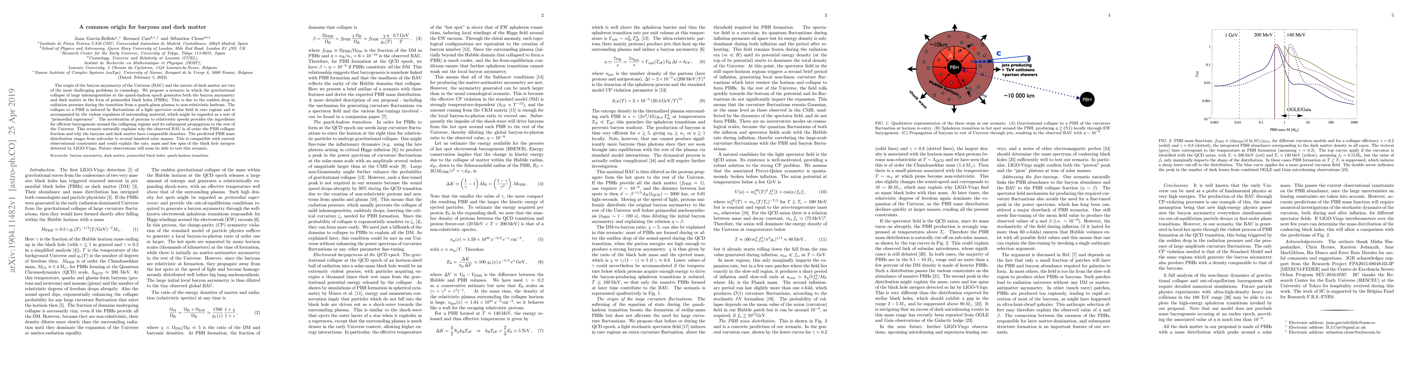 The origin of the baryon asymmetry of the Universe (BAU) and the nature of dark matter are two of the most challenging problems in cosmology. We propose a scenario in which the gravitational collapse of large inhomogeneities at the quark-hadron epoch generates both the baryon asymmetry and dark matter in the form of primordial black holes (PBHs). This is due to the sudden drop in radiation pressure during the transition from a quark-gluon plasma to non-relativistic hadrons. The collapse to a PBH is induced by fluctuations of a light spectator scalar field in rare regions and is accompanied by the violent expulsion of surrounding material, which might be regarded as a sort of "primordial supernova" . The acceleration of protons to relativistic speeds provides the ingredients for efficient baryogenesis around the collapsing regions and its subsequent propagation to the rest of the Universe. This scenario naturally explains why the observed BAU is of order the PBH collapse fraction and why the baryons and dark matter have comparable densities. The predicted PBH mass distribution ranges from sub-solar to several hundred solar masses. This is compatible with current observational constraints and could explain the rate, mass and low spin of the black hole mergers detected by LIGO-Virgo. Future observations will soon be able to test this scenario.
