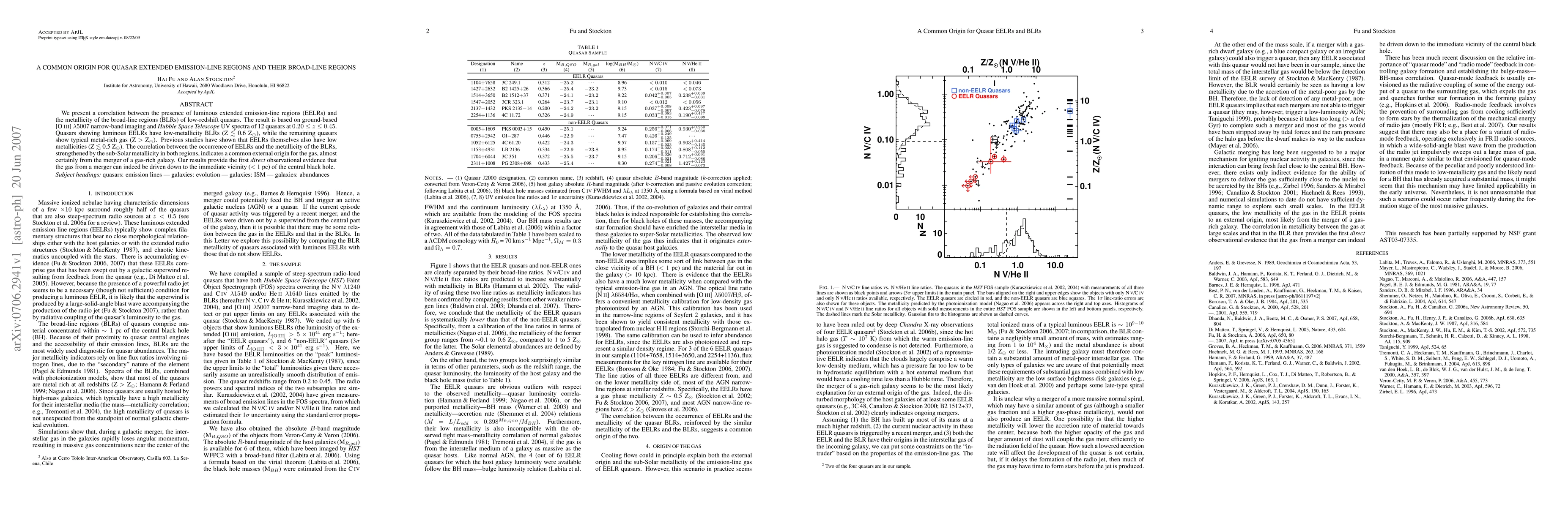 We present a correlation between the presence of luminous extended emission-line regions (EELRs) and the metallicity of the broad-line regions (BLRs) of low-redshift quasars. The result is based on ground-based [O III] 5007 narrow-band imaging and Hubble Space Telescope UV spectra of 12 quasars at 0.20 < z < 0.45. Quasars showing luminous EELRs have low-metallicity BLRs (Z < 0.6 Z_Solar), while the remaining quasars show typical metal-rich gas (Z > Z_Solar). Previous studies have shown that EELRs themselves also have low metallicities (Z < 0.5 Z_Solar). The correlation between the occurrence of EELRs and the metallicity of the BLRs, strengthened by the sub-Solar metallicity in both regions, indicates a common external origin for the gas, almost certainly from the merger of a gas-rich galaxy. Our results provide the first direct observational evidence that the gas from a merger can indeed be driven down to the immediate vicinity (< 1 pc) of the central black hole.