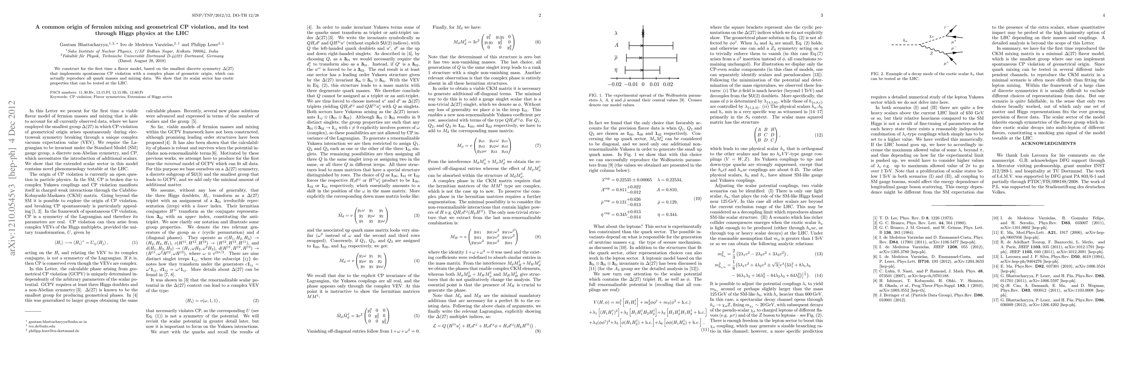 This paper proposes a novel flavor model using the Delta(27) symmetry to achieve spontaneous CP violation and reproduce quark masses and mixing, suggesting that its unique scalar sector features can be experimentally tested at the LHC. The model's implications for Higgs physics are explored as a means to verify its predictions.