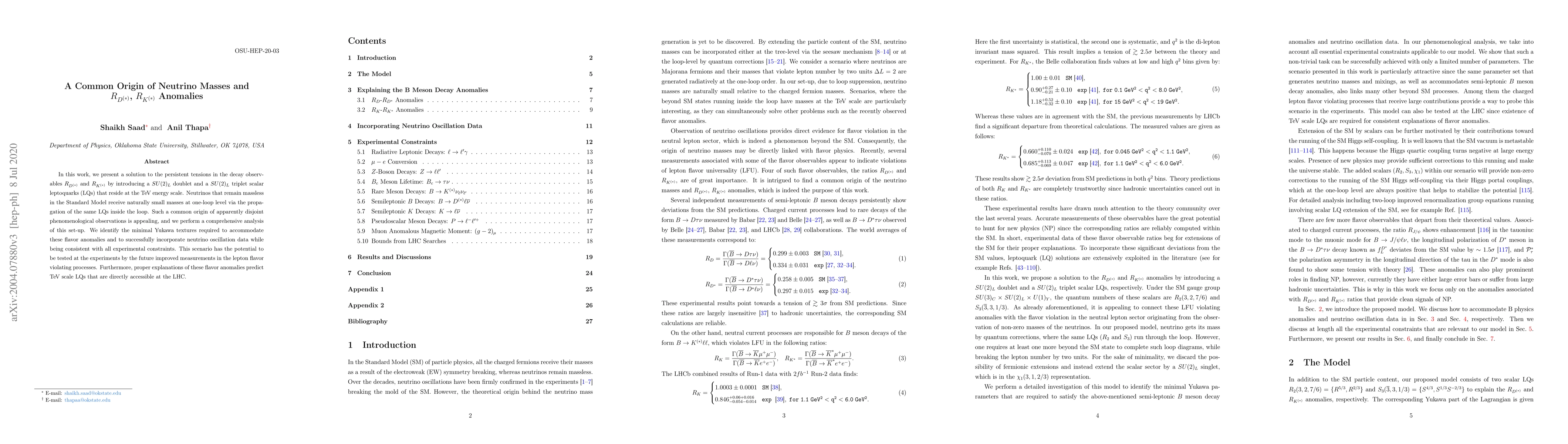 This paper proposes a solution to the $R_{D^{(\ast)}}$ and $R_{K^{(\ast)}}$ anomalies by introducing $SU(2)_L$ doublet and triplet scalar leptoquarks, which also provide a one-loop mechanism for naturally small neutrino masses. The model is consistent with experimental constraints and could be tested via future LHC experiments and lepton flavor violating processes.
