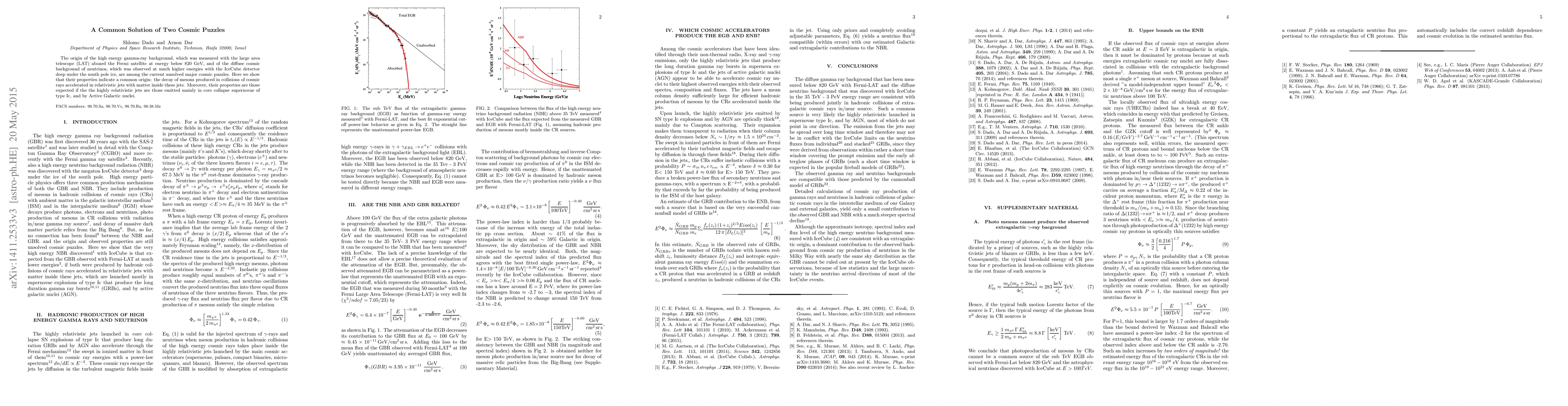 The origin of the diffuse extragalactic gamma-ray background, which was measured with the large area telescope (LAT) aboard the Fermi satellite at energy below 820 GeV, and of the diffuse cosmic background of neutrinos, which was observed at much higher energies with the IceCube detector deep under the south pole ice, are among the current unsolved major cosmic puzzles. Here we show that their properties indicate a common origin: the decay of mesons produced in collisions of cosmic rays accelerated in relativistic jets with matter in/near source. Moreover, their properties are those expected if these highly relativistic jets are those that produce long duration gamma ray bursts in core collapse supernovae of type Ic, which take place mostly in the densest regions of giant molecular clouds in star forming galaxies, and those that are fired by blazars into their broad line region (BLR), which contains millions of mini-clouds.