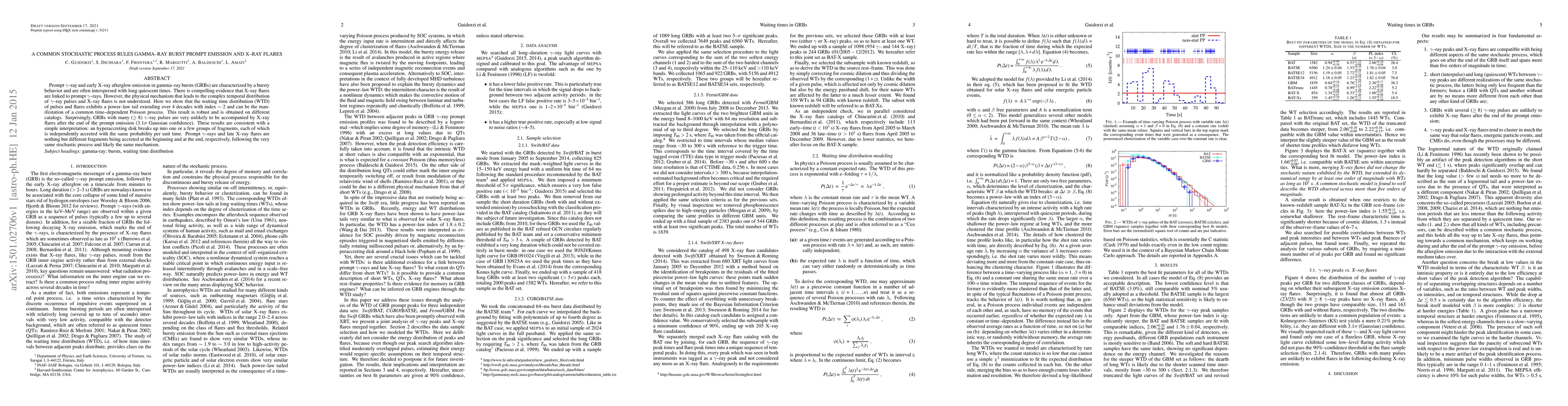 This paper demonstrates that the waiting time distribution of gamma-ray bursts and X-ray flares follows a power-law tail indicative of a common stochastic process, suggesting that both phenomena arise from the same underlying mechanism. The study finds that GRBs with many gamma-ray pulses are unlikely to have subsequent X-ray flares, supporting a model where fragments from an accreting disk are independently processed over time.