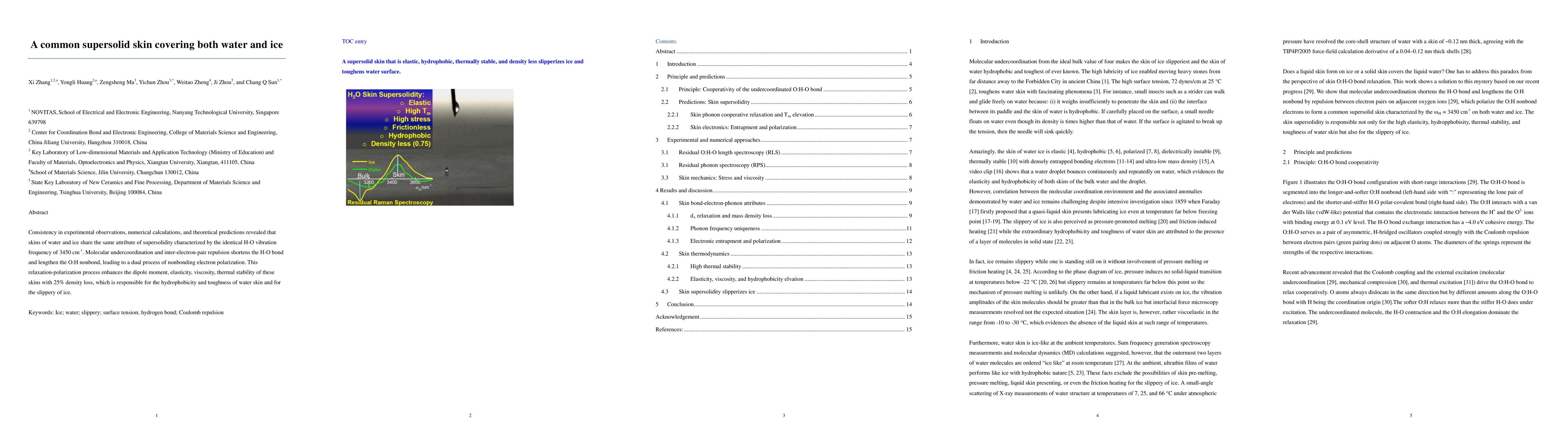 Summary: The paper explores the supersolidity of water and ice surfaces, revealing that both exhibit a unique H-O vibration frequency. This molecular undercoordination and electron polarization enhance the skins' elasticity, viscosity, and thermal stability, resulting in a 25% density reduction, hydrophobicity, and slipperiness.