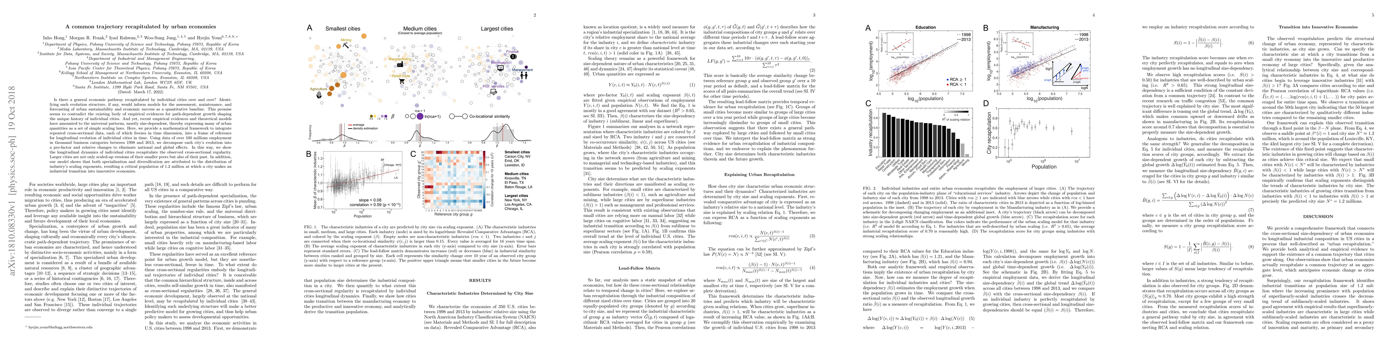 Is there a general economic pathway recapitulated by individual cities over and over? Identifying such evolution structure, if any, would inform models for the assessment, maintenance, and forecasting of urban sustainability and economic success as a quantitative baseline. This premise seems to contradict the existing body of empirical evidences for path-dependent growth shaping the unique history of individual cities. And yet, recent empirical evidences and theoretical models have amounted to the universal patterns, mostly size-dependent, thereby expressing many of urban quantities as a set of simple scaling laws. Here, we provide a mathematical framework to integrate repeated cross-sectional data, each of which freezes in time dimension, into a frame of reference for longitudinal evolution of individual cities in time. Using data of over 100 millions employment in thousand business categories between 1998 and 2013, we decompose each city's evolution into a pre-factor and relative changes to eliminate national and global effects. In this way, we show the longitudinal dynamics of individual cities recapitulate the observed cross-sectional regularity. Larger cities are not only scaled-up versions of their smaller peers but also of their past. In addition, our model shows that both specialization and diversification are attributed to the distribution of industry's scaling exponents, resulting a critical population of 1.2 million at which a city makes an industrial transition into innovative economies.