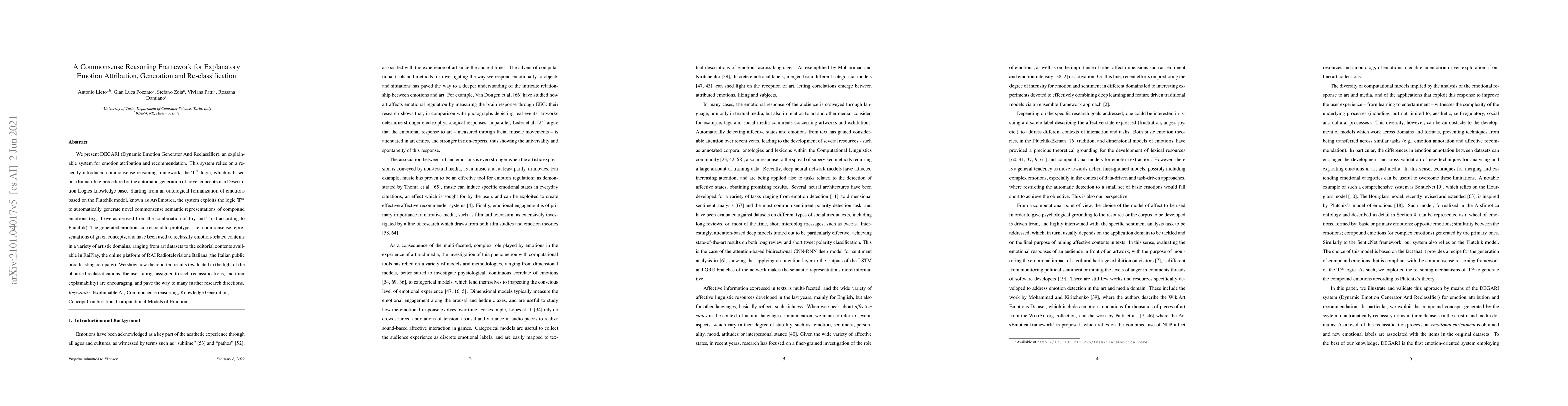We present DEGARI (Dynamic Emotion Generator And ReclassIfier), an explainable system for emotion attribution and recommendation. This system relies on a recently introduced commonsense reasoning framework, the TCL logic, which is based on a human-like procedure for the automatic generation of novel concepts in a Description Logics knowledge base. Starting from an ontological formalization of emotions based on the Plutchik model, known as ArsEmotica, the system exploits the logic TCL to automatically generate novel commonsense semantic representations of compound emotions (e.g. Love as derived from the combination of Joy and Trust according to Plutchik). The generated emotions correspond to prototypes, i.e. commonsense representations of given concepts, and have been used to reclassify emotion-related contents in a variety of artistic domains, ranging from art datasets to the editorial contents available in RaiPlay, the online platform of RAI Radiotelevisione Italiana (the Italian public broadcasting company). We show how the reported results (evaluated in the light of the obtained reclassifications, the user ratings assigned to such reclassifications, and their explainability) are encouraging, and pave the way to many further research directions.