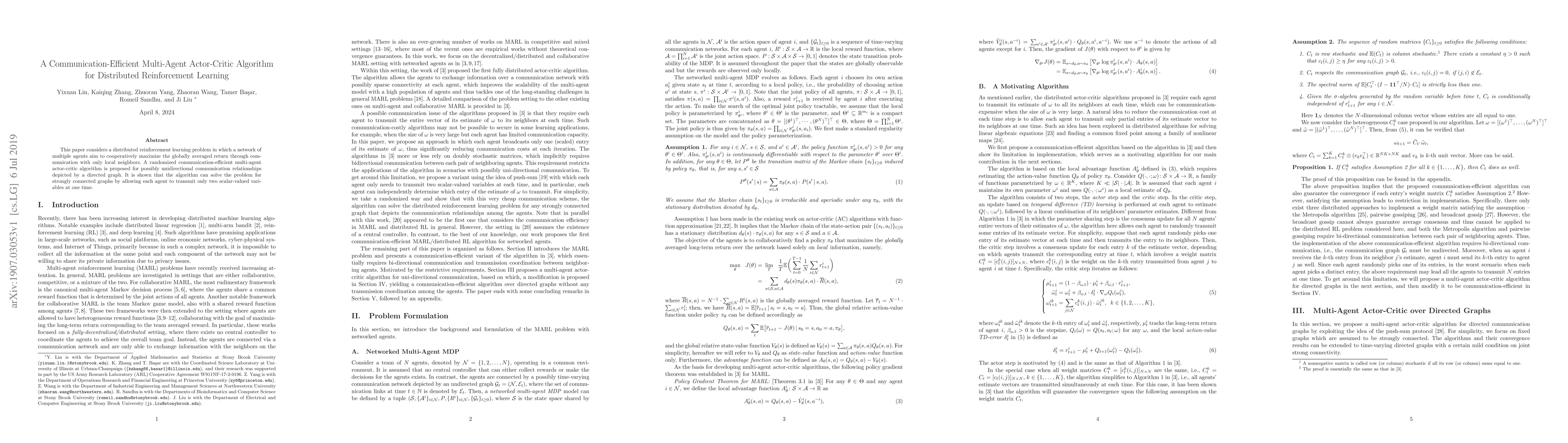 This paper proposes a communication-efficient multi-agent actor-critic algorithm for distributed reinforcement learning, enabling agents to maximize global returns through local neighbor interactions while transmitting minimal data. The algorithm is effective for strongly connected graphs, requiring each agent to send just two scalar variables at once.