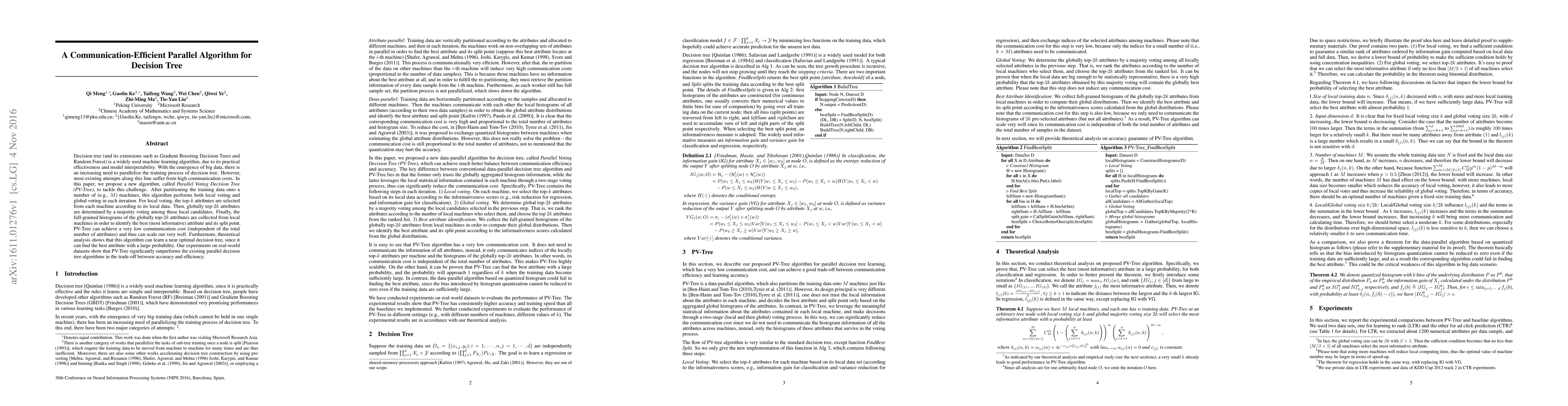 This paper introduces the Parallel Voting Decision Tree (PV-Tree) algorithm to efficiently parallelize decision tree training, minimizing communication costs. PV-Tree selects top attributes locally and determines global top candidates via majority voting, achieving low communication overhead and scaling well. Experimental results show PV-Tree outperforms existing methods in balancing accuracy and efficiency.