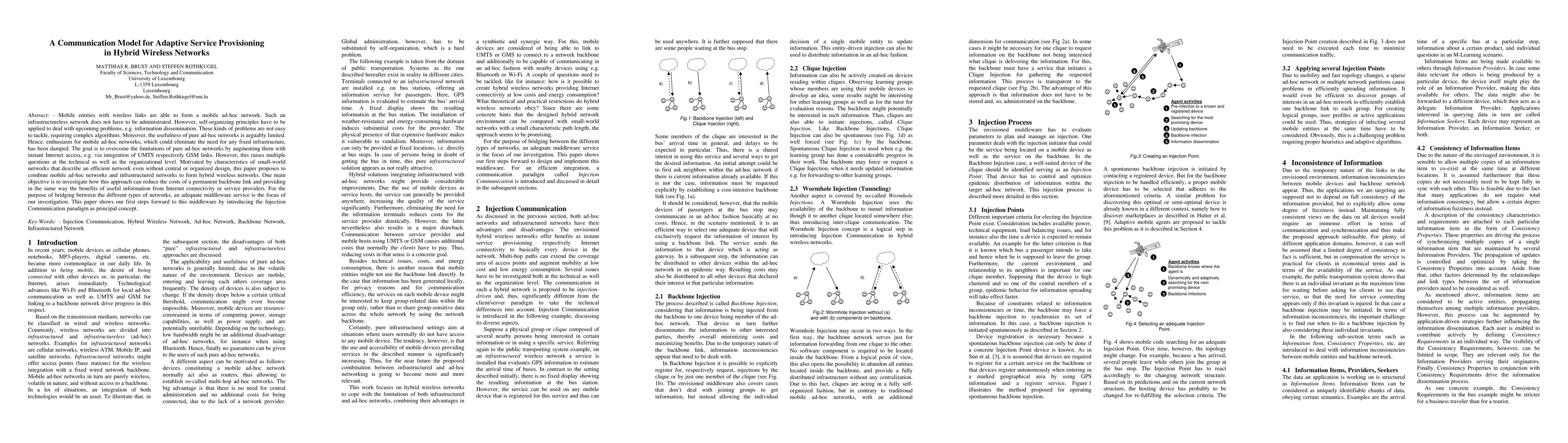 Mobile entities with wireless links are able to form a mobile ad-hoc network. Such an infrastructureless network does not have to be administrated. However, self-organizing principles have to be applied to deal with upcoming problems, e.g. information dissemination. These kinds of problems are not easy to tackle, requiring complex algorithms. Moreover, the usefulness of pure ad-hoc networks is arguably limited. Hence, enthusiasm for mobile ad-hoc networks, which could eliminate the need for any fixed infrastructure, has been damped. The goal is to overcome the limitations of pure ad-hoc networks by augmenting them with instant Internet access, e.g. via integration of UMTS respectively GSM links. However, this raises multiple questions at the technical as well as the organizational level. Motivated by characteristics of small-world networks that describe an efficient network even without central or organized design, this paper proposes to combine mobile ad-hoc networks and infrastructured networks to form hybrid wireless networks. One main objective is to investigate how this approach can reduce the costs of a permanent backbone link and providing in the same way the benefits of useful information from Internet connectivity or service providers. For the purpose of bridging between the different types of networks, an adequate middleware service is the focus of our investigation. This paper shows our first steps forward to this middleware by introducing the Injection Communication paradigm as principal concept.