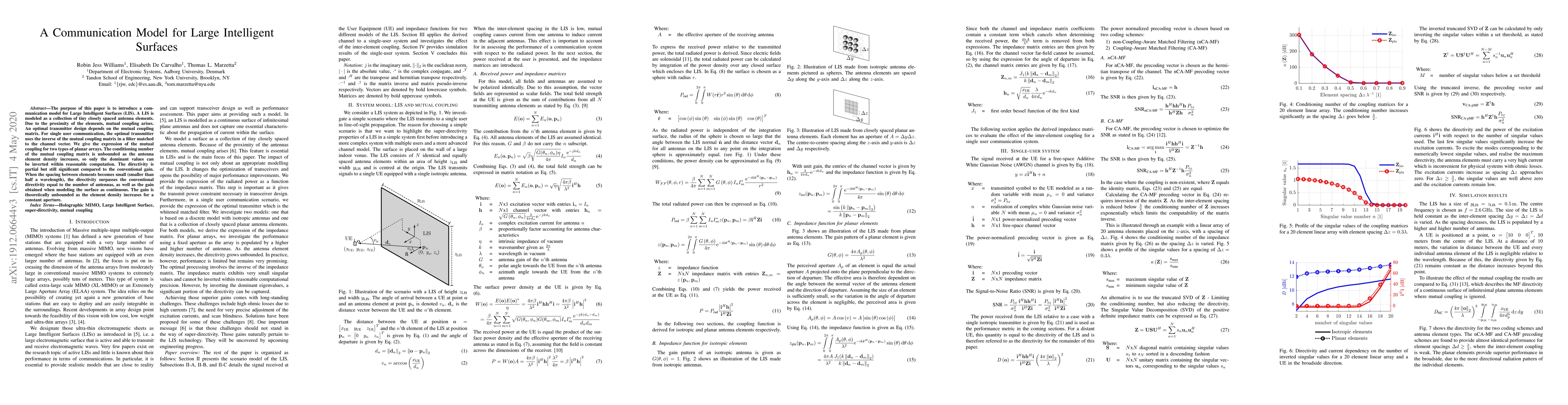 The purpose of this paper is to introduce a communication model for Large Intelligent Surfaces (LIS). A LIS is modelled as a collection of tiny closely spaced antenna elements. Due to the proximity of the elements, mutual coupling arises. An optimal transmitter design depends on the mutual coupling matrix. For single user communication, the optimal transmitter uses the inverse of the mutual coupling matrix in a filter matched to the channel vector. We give the expression of the mutual coupling for two types of planar arrays. The conditioning number of the mutual coupling matrix is unbounded as the antenna element density increases, so only the dominant values can be inverted within reasonable computation. The directivity is partial but still significant compared to the conventional gain. When the spacing between elements becomes small (smaller than half a wavelength), the directivity surpasses the conventional directivity equal to the number of antennas, as well as the gain obtained when modelling the surface as continuous. The gain is theoretically unbounded as the element density increases for a constant aperture.