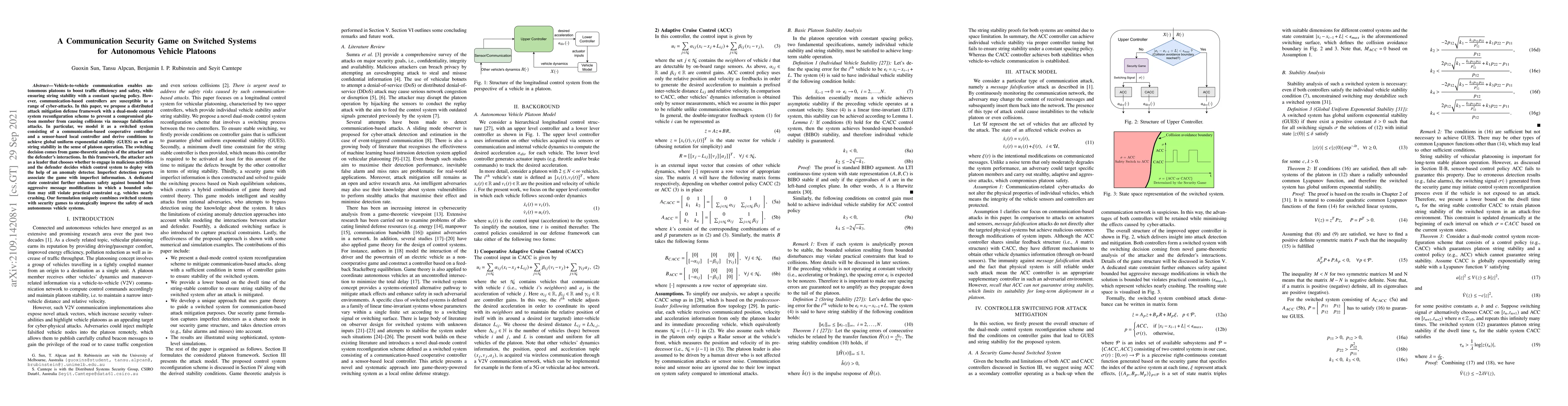 This paper proposes a defense framework for autonomous vehicle platoons using a dual-mode control system and game-theoretic analysis to mitigate communication-based attacks. It combines switched systems and security games to achieve global stability and string stability while preventing collisions from message falsification attacks.