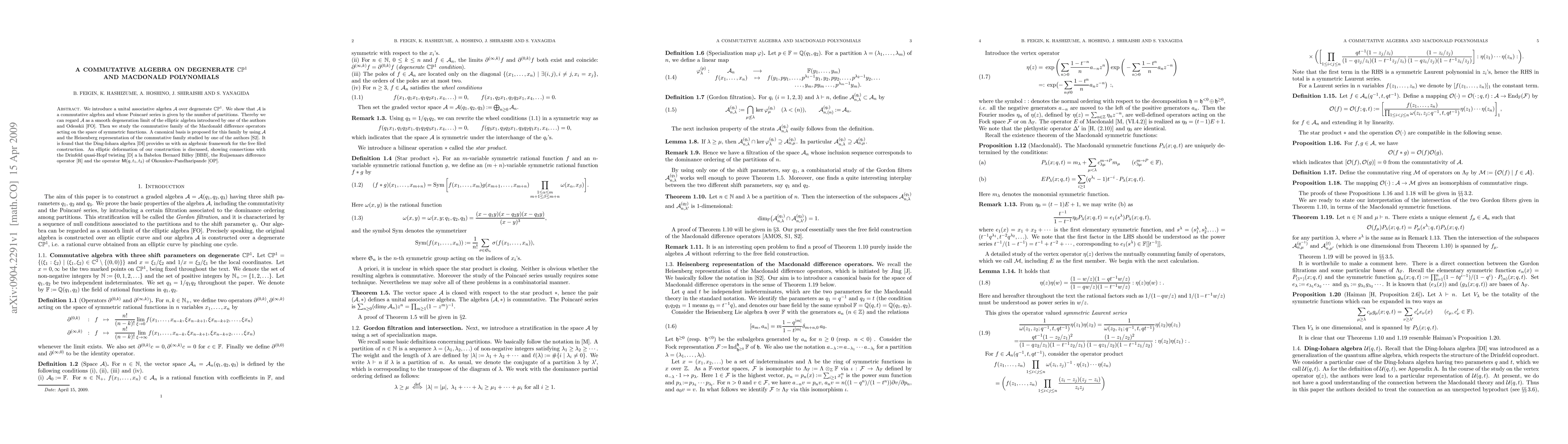 This paper introduces a commutative algebra A on degenerate CP^1, demonstrating its Poincaré series relates to the number of partitions. It further explores Macdonald difference operators on symmetric functions, proposing a canonical basis using A and the Heisenberg representation, and finds connections to the Ding-Iohara algebra and elliptic deformations.