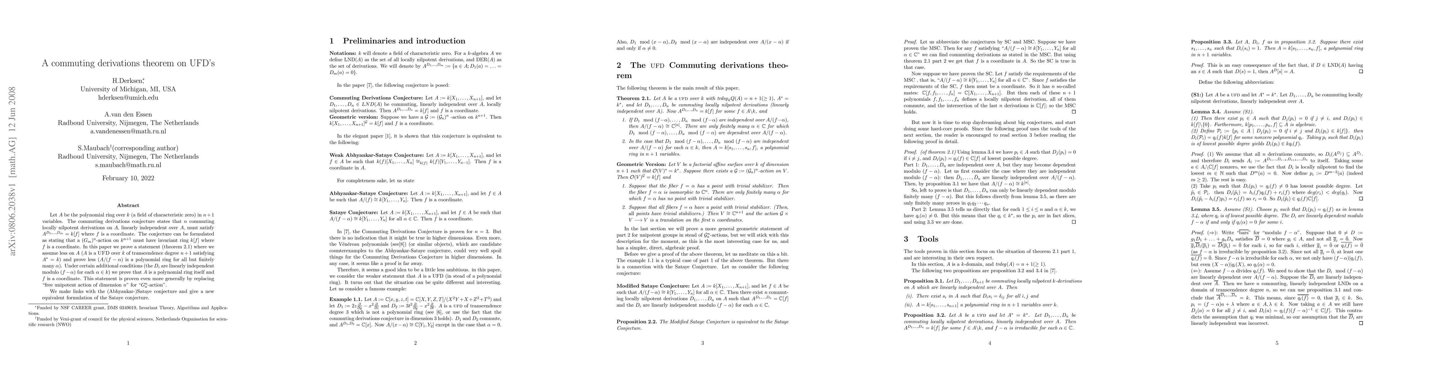 Let $A$ be the polynomial ring over $k$ (a field of characteristic zero) in $n+1$ variables. The commuting derivations conjecture states that $n$ commuting locally nilpotent derivations on $A$, linearly independent over $A$, must satisfy $A^{D_1,...,D_m}=k[f]$ where $f$ is a coordinate. The conjecture can be formulated as stating that a $(G_m)^n$-action on $k^{n+1}$ must have invariant ring $k[f]$ where $f$ is a coordinate. In this paper we prove a statement (theorem \ref{CDH2}) where we assume less on $A$ ($A$ is a {\sc UFD} over $k$ of transcendence degree $n+1$ satisfying $A^*=k$) and prove less ($A/(f-\alpha)$ is a polynomial ring for all but finitely many $\alpha$). Under certain additional conditions (the $D_i$ are linearly independent modulo $(f-\alpha)$ for each $\alpha\in k$) we prove that $A$ is a polynomial ring itself and $f$ is a coordinate. This statement is proven even more generally by replacing ``free unipotent action of dimension $n$'' for ``$G_a^n$-action''. We make links with the (Abhyankar-)Sataye conjecture and give a new equivalent formulation of the Sataye conjecture.