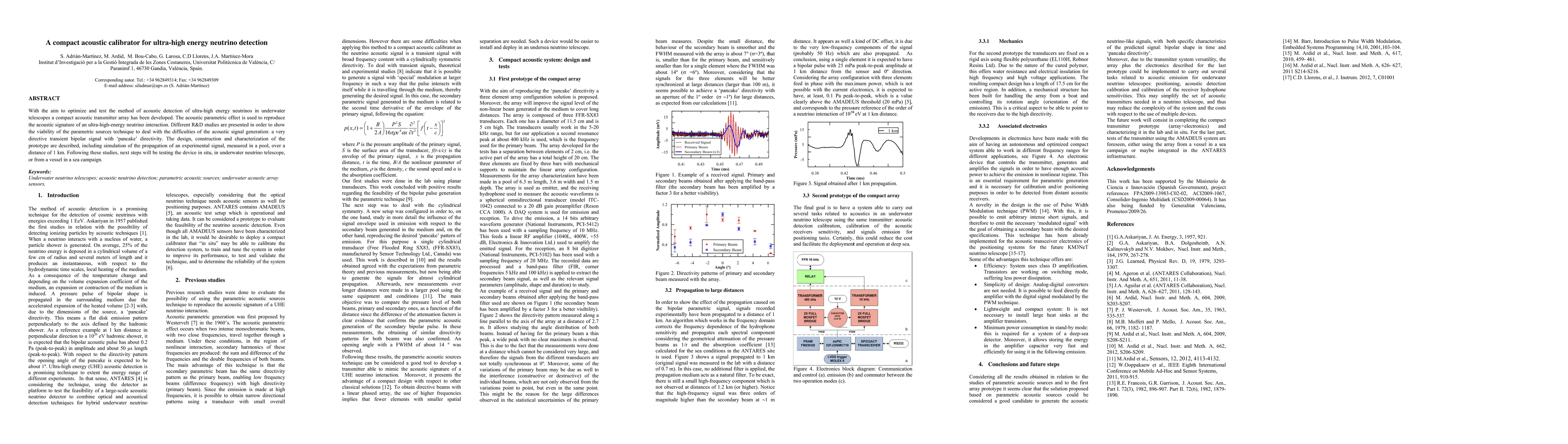 With the aim to optimize and test the method of acoustic detection of ultra-high energy neutrinos in underwater telescopes a compact acoustic transmitter array has been developed. The acoustic parametric effect is used to reproduce the acoustic signature of an ultra-high-energy neutrino interaction. Different reseach and development studies are presented in order to show the viability of the parametric sources technique to deal with the difficulties of the acoustic signal generation: a very directive transient bipolar signal with pancake directivity. The design, construction and characterization of the prototype are described, including simulation of the propagation of an experimental signal, measured in a pool, over a distance of 1 km. Following these studies, next steps will be testing the device in situ, in underwater neutrino telescope, or from a vessel in a sea campaign.