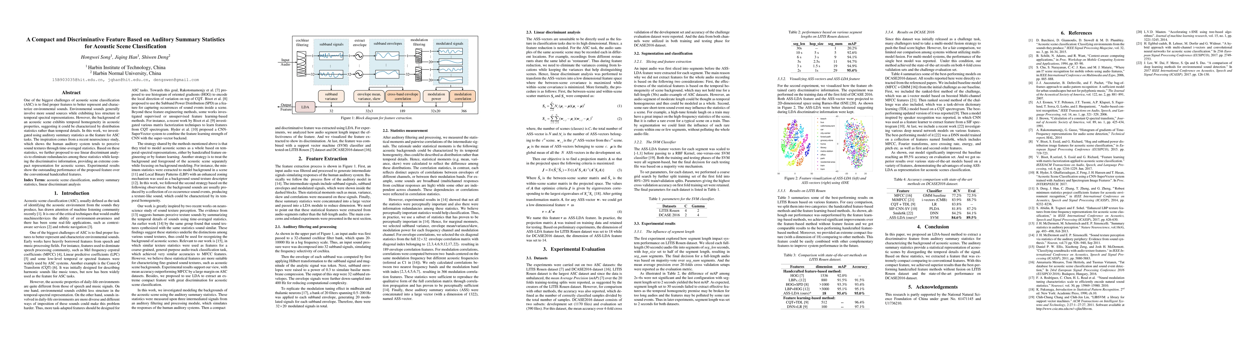 This paper proposes a compact and discriminative feature based on auditory summary statistics for acoustic scene classification, inspired by neuroscience findings on human auditory perception. The method uses linear discriminant analysis to refine these statistics, achieving superior performance compared to conventional handcrafted features.