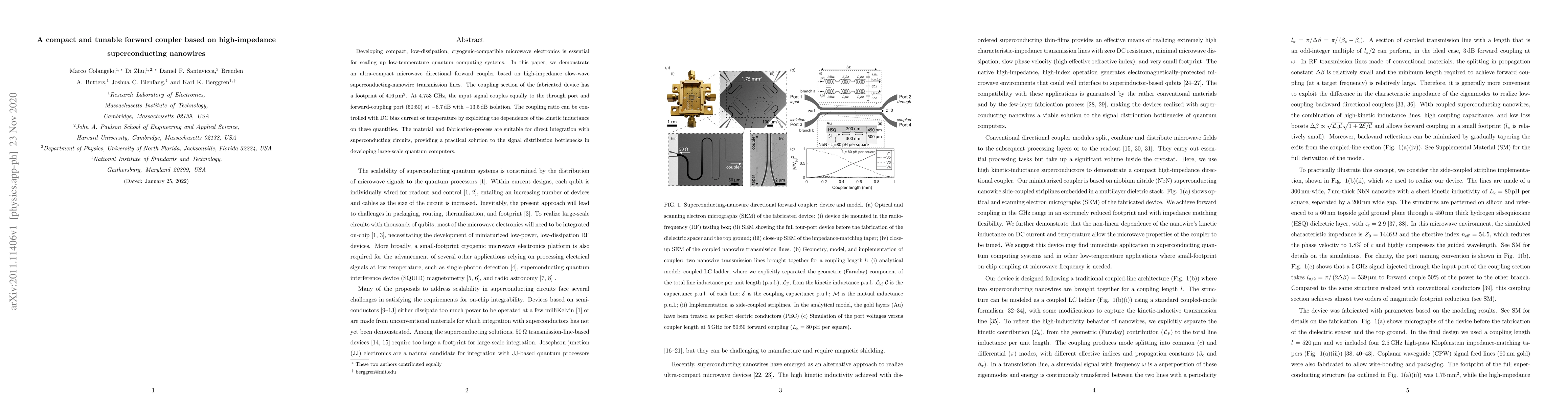 Developing compact, low-dissipation, cryogenic-compatible microwave electronics is essential for scaling up low-temperature quantum computing systems. In this paper, we demonstrate an ultra-compact microwave directional forward coupler based on high-impedance slow-wave superconducting-nanowire transmission lines. The coupling section of the fabricated device has a footprint of $416\,\mathrm{\mu m^2}$. At 4.753 GHz, the input signal couples equally to the through port and forward-coupling port (50:50) at $-6.7\,\mathrm{dB}$ with $-13.5\,\mathrm{dB}$ isolation. The coupling ratio can be controlled with DC bias current or temperature by exploiting the dependence of the kinetic inductance on these quantities. The material and fabrication-process are suitable for direct integration with superconducting circuits, providing a practical solution to the signal distribution bottlenecks in developing large-scale quantum computers.