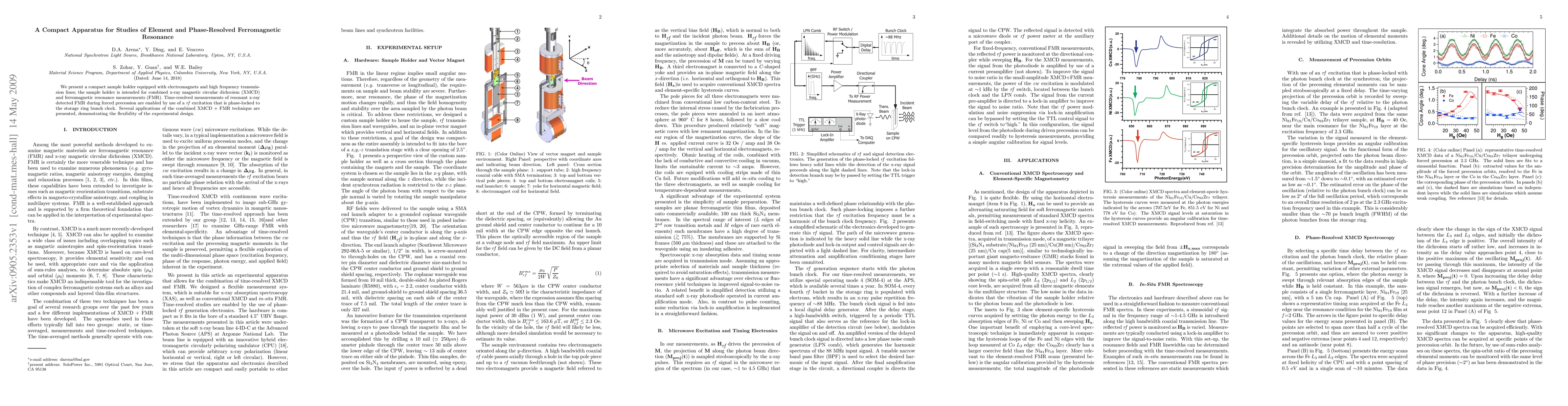 This paper introduces a compact sample holder with electromagnets and high-frequency lines for combined x-ray magnetic circular dichroism (XMCD) and ferromagnetic resonance (FMR) measurements. The apparatus enables time-resolved, resonant x-ray detected FMR with phase-locked rf excitation, showcasing its versatility in various applications.