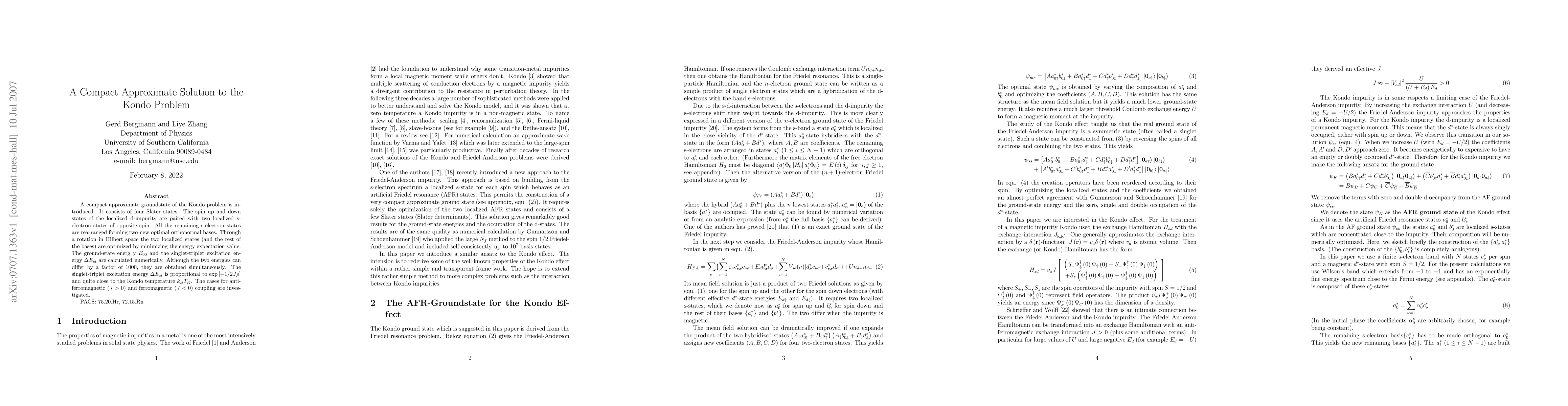 This paper introduces a compact approximate solution to the Kondo problem using four Slater states, optimizing them through a Hilbert space rotation to minimize energy. The study calculates the ground-state energy and singlet-triplet excitation energy, finding them proportional to the Kondo temperature, and investigates both anti-ferromagnetic and ferromagnetic coupling scenarios.