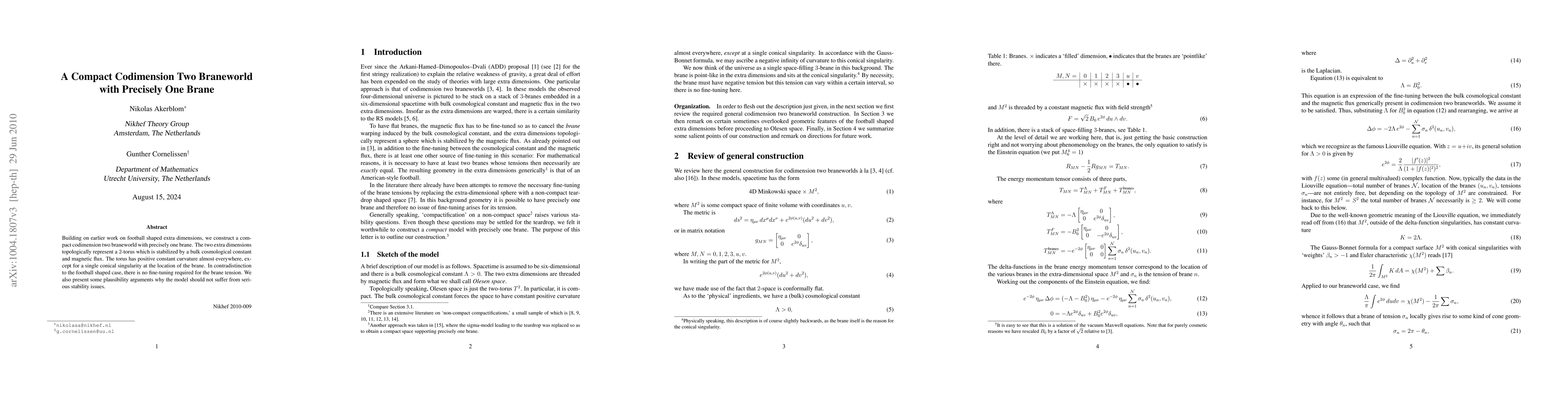 Researchers create a compact codimension two braneworld with one brane, featuring a stable 2-torus-shaped torus stabilized by a bulk cosmological constant and magnetic flux, eliminating fine-tuning for the brane tension.