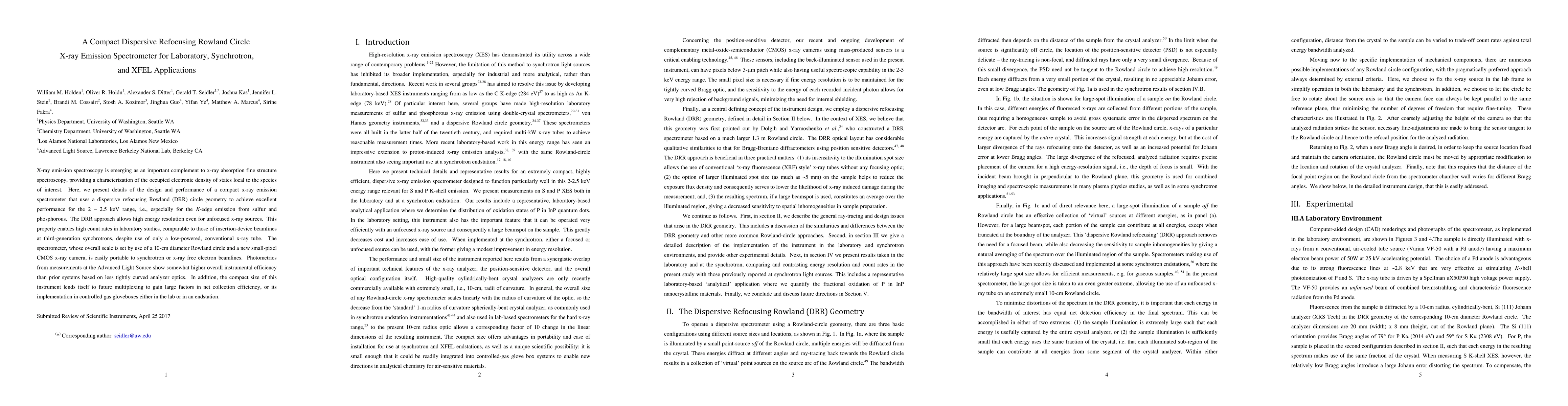 This paper details a compact x-ray emission spectrometer utilizing a dispersive refocusing Rowland circle geometry, achieving high energy resolution and performance for 2-2.5 keV energy range, suitable for laboratory, synchrotron, and XFEL applications. The design allows for high count rates and portability, with improved efficiency and potential for future multiplexing.