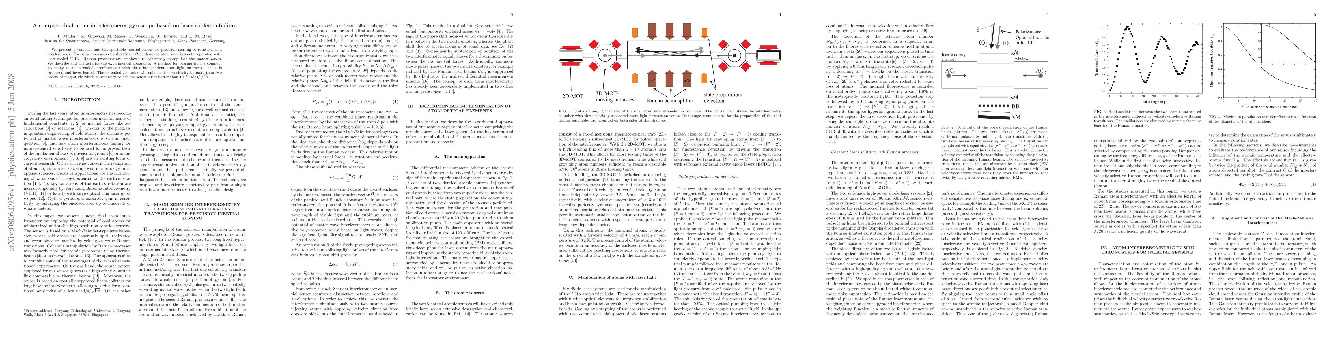 This paper introduces a compact dual atom interferometer gyroscope using laser-cooled rubidium atoms for precise rotational and acceleration sensing. The device employs Raman processes to manipulate matter waves and proposes an extended interferometer design to enhance sensitivity by over two orders of magnitude.