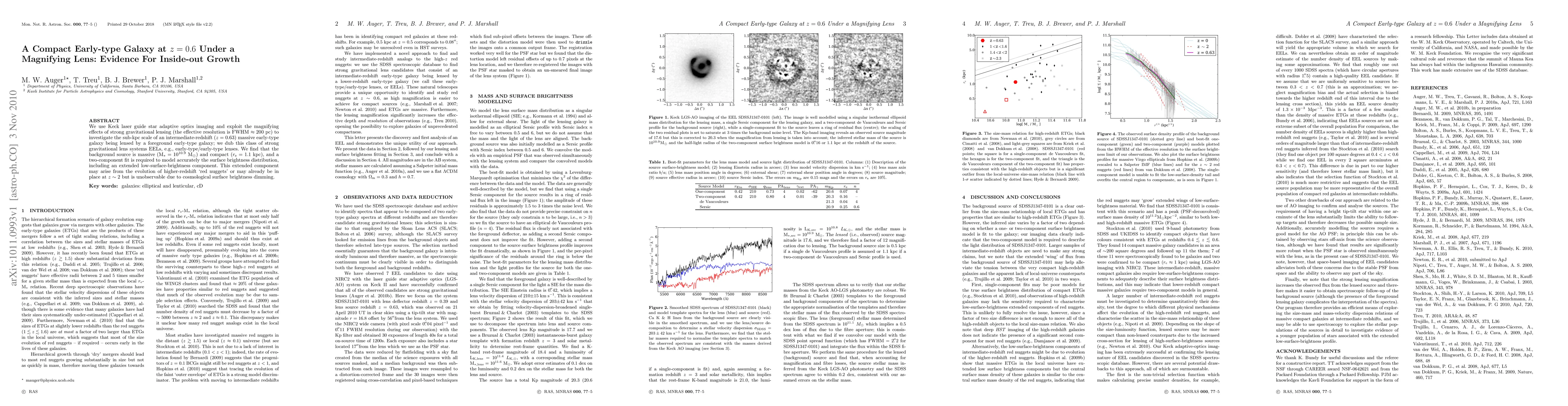 This study uses adaptive optics imaging and strong gravitational lensing to examine a massive, compact early-type galaxy at redshift 0.6. The research reveals a two-component structure, with a massive, dense core and an extended, low-surface-brightness component. This extended component could be a remnant of higher-redshift 'red nuggets' or present at earlier cosmic times but currently unobservable due to surface brightness dimming.