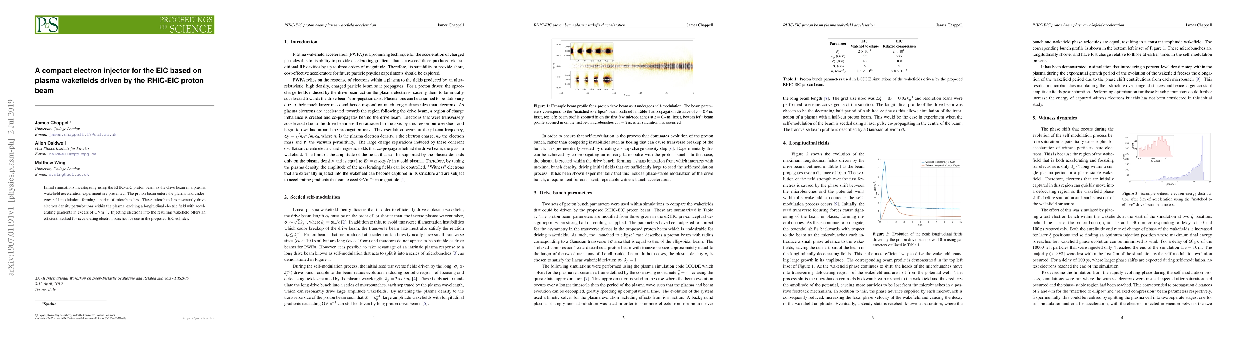 Initial simulations investigating using the RHIC-EIC proton beam as the drive beam in a plasma wakefield acceleration experiment are presented. The proton beam enters the plasma and undergoes self-modulation, forming a series of microbunches. These microbunches resonantly drive electron density perturbations within the plasma, exciting a longitudinal electric field with accelerating gradients in excess of $\mathrm{GVm^{-1}}$. Injecting electrons into the resulting wakefield offers an efficient method for accelerating electron bunches for use in the proposed EIC collider.