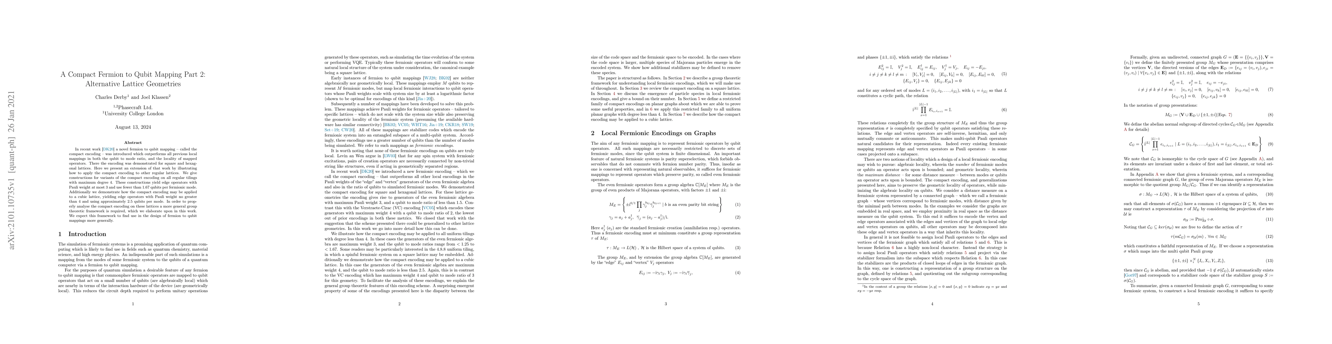 In recent work [arXiv:2003.06939v2] a novel fermion to qubit mapping -- called the compact encoding -- was introduced which outperforms all previous local mappings in both the qubit to mode ratio, and the locality of mapped operators. There the encoding was demonstrated for square and hexagonal lattices. Here we present an extension of that work by illustrating how to apply the compact encoding to other regular lattices. We give constructions for variants of the compact encoding on all regular tilings with maximum degree 4. These constructions yield edge operators with Pauli weight at most 3 and use fewer than 1.67 qubits per fermionic mode. Additionally we demonstrate how the compact encoding may be applied to a cubic lattice, yielding edge operators with Pauli weight no greater than 4 and using approximately 2.5 qubits per mode. In order to properly analyse the compact encoding on these lattices a more general group theoretic framework is required, which we elaborate upon in this work. We expect this framework to find use in the design of fermion to qubit mappings more generally.