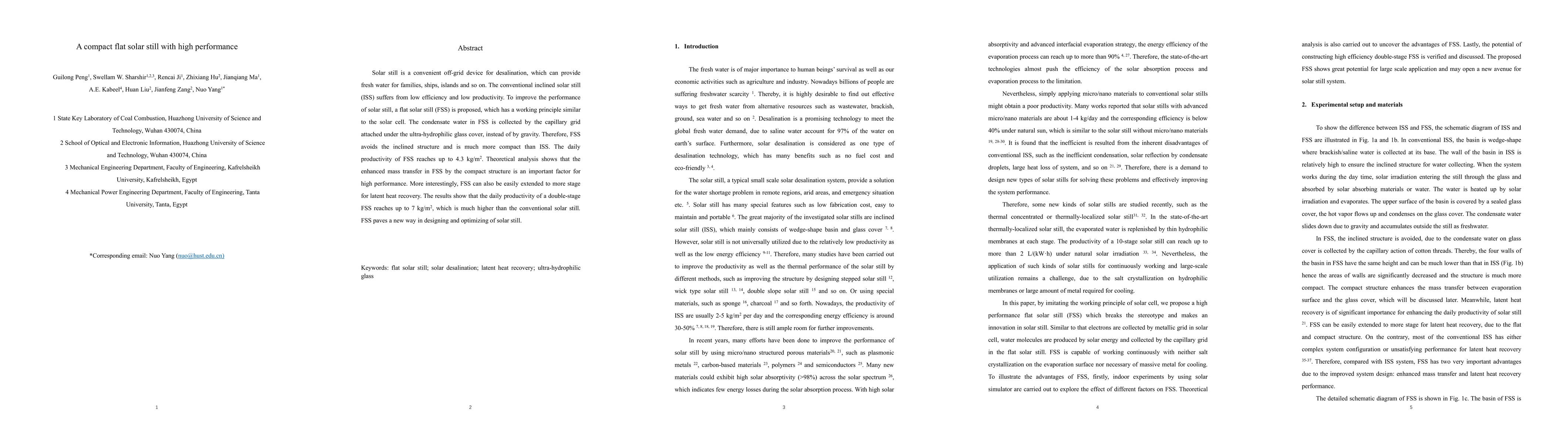 Solar still is a convenient off-grid device for desalination, which can provide fresh water for families, ships, islands and so on. The conventional inclined solar still (ISS) suffers from low efficiency and low productivity. To improve the performance of solar still, a flat solar still (FSS) is proposed, which has a working principle similar to the solar cell. The condensate water in FSS is collected by the capillary grid attached under the ultra-hydrophilic glass cover, instead of by gravity. Therefore, FSS avoids the inclined structure and is much more compact than ISS. The daily productivity of FSS reaches up to 4.3 kg/m2. Theoretical analysis shows that the enhanced mass transfer in FSS by the compact structure is an important factor for high performance. More interestingly, FSS can also be easily extended to more stage for latent heat recovery. The results show that the daily productivity of a double-stage FSS reaches up to 7 kg/m2, which is much higher than the conventional solar still. FSS paves a new way in designing and optimizing of solar still.