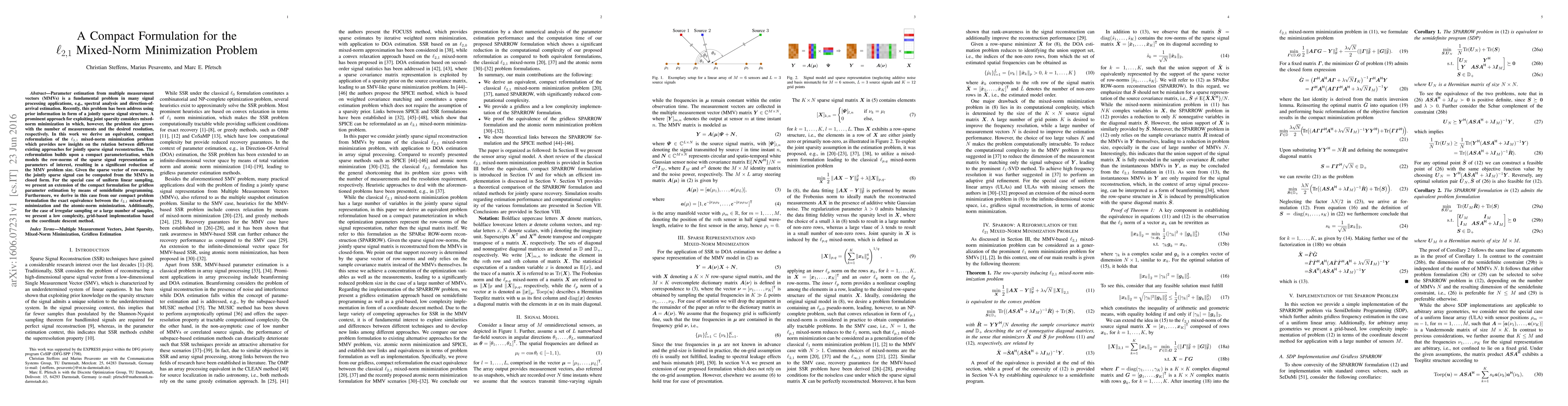 Parameter estimation from multiple measurement vectors (MMVs) is a fundamental problem in many signal processing applications, e.g., spectral analysis and direction-of- arrival estimation. Recently, this problem has been address using prior information in form of a jointly sparse signal structure. A prominent approach for exploiting joint sparsity considers mixed-norm minimization in which, however, the problem size grows with the number of measurements and the desired resolution, respectively. In this work we derive an equivalent, compact reformulation of the $\ell_{2,1}$ mixed-norm minimization problem which provides new insights on the relation between different existing approaches for jointly sparse signal reconstruction. The reformulation builds upon a compact parameterization, which models the row-norms of the sparse signal representation as parameters of interest, resulting in a significant reduction of the MMV problem size. Given the sparse vector of row-norms, the jointly sparse signal can be computed from the MMVs in closed form. For the special case of uniform linear sampling, we present an extension of the compact formulation for gridless parameter estimation by means of semidefinite programming. Furthermore, we derive in this case from our compact problem formulation the exact equivalence between the $\ell_{2,1}$ mixed-norm minimization and the atomic-norm minimization. Additionally, for the case of irregular sampling or a large number of samples, we present a low complexity, grid-based implementation based on the coordinate descent method.