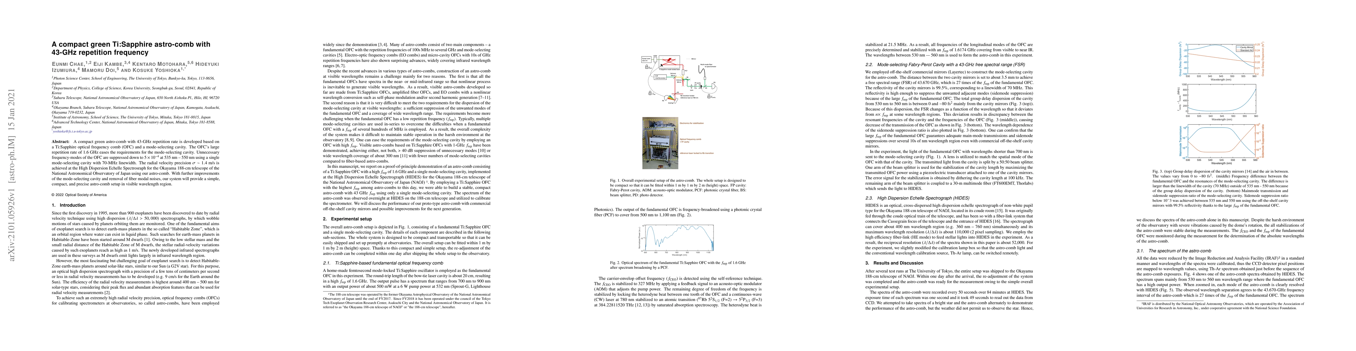 A compact green astro-comb with 43-GHz repetition rate is developed based on a Ti:Sapphire optical frequency comb (OFC) and a mode-selecting cavity. The OFC's large repetition rate of 1.6 GHz eases the requirements for the mode-selecting cavity. Unnecessary frequency-modes of the OFC are suppressed down to $5 \times 10^{-4}$ at 535 nm - 550 nm using a single mode-selecting cavity with 70-MHz linewidth. The radial velocity precision $\sigma \sim 1.4$ m/s is achieved at the High Dispersion Echelle Spectrosraph for the Okayama 188-cm telescope of the National Astronomical Observatory of Japan using our astro-comb. With further improvements of the mode-selecting cavity and removal of fiber modal noises, our system will provide a simple, compact, and precise astro-comb setup in visible wavelength region.