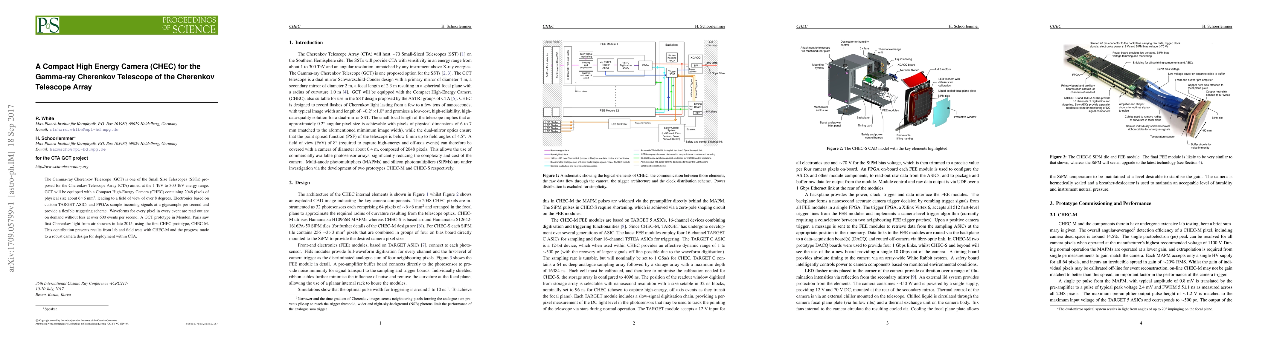 The Gamma-ray Cherenkov Telescope (GCT) features a Compact High-Energy Camera (CHEC) with 2048 pixels, designed for the Cherenkov Telescope Array (CTA) to detect gamma rays in the 1-300 TeV range. The CHEC prototype, CHEC-M, has been tested successfully, leading to advancements in camera design for CTA deployment.