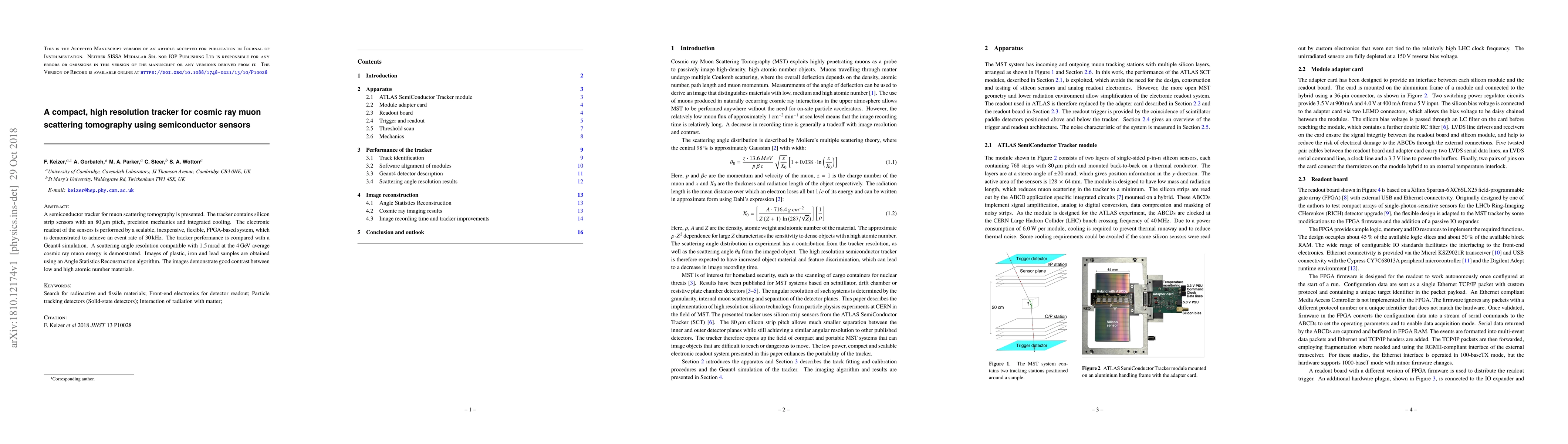 This paper presents a compact, high-resolution tracker using silicon strip sensors for cosmic ray muon scattering tomography. The tracker achieves a scattering angle resolution of 1.5 mrad and demonstrates effective imaging of materials with varying atomic numbers.