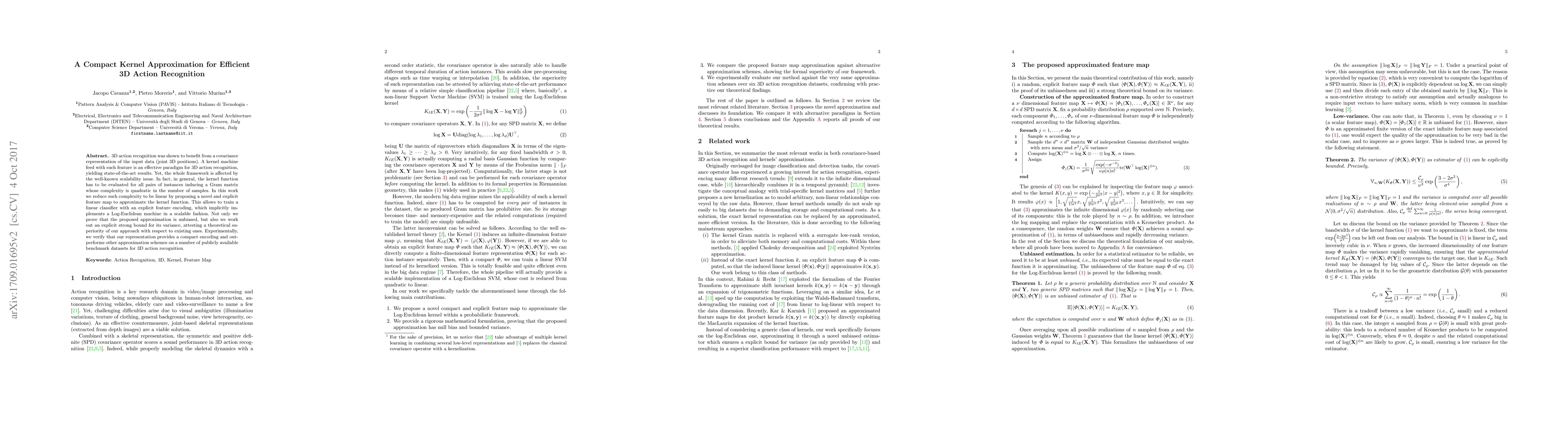 This paper proposes a novel linear kernel approximation to address scalability issues in 3D action recognition using kernel machines. The method provides an explicit feature map that reduces computational complexity from quadratic to linear, enabling efficient training of a linear classifier while maintaining theoretical and empirical performance superiority over existing approximation schemes.