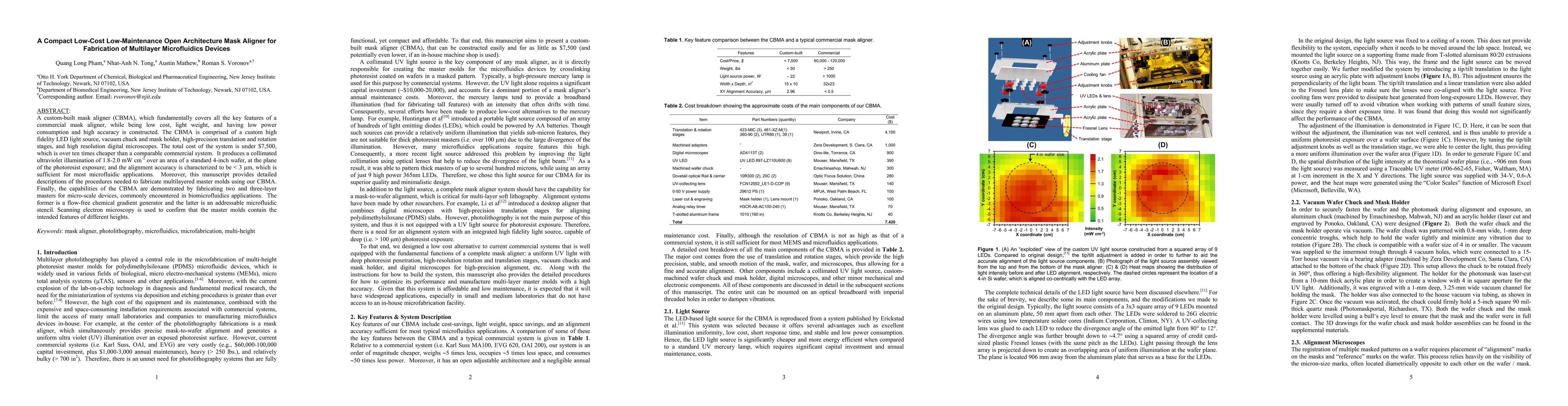 This paper describes a low-cost, compact mask aligner (CBMA) for fabricating multilayer microfluidic devices, featuring a high-fidelity LED light source and precise alignment stages. The CBMA is significantly cheaper than commercial alternatives, with a total cost under $7,500, and demonstrates alignment accuracy of < 3 microns, sufficient for microfluidic applications.