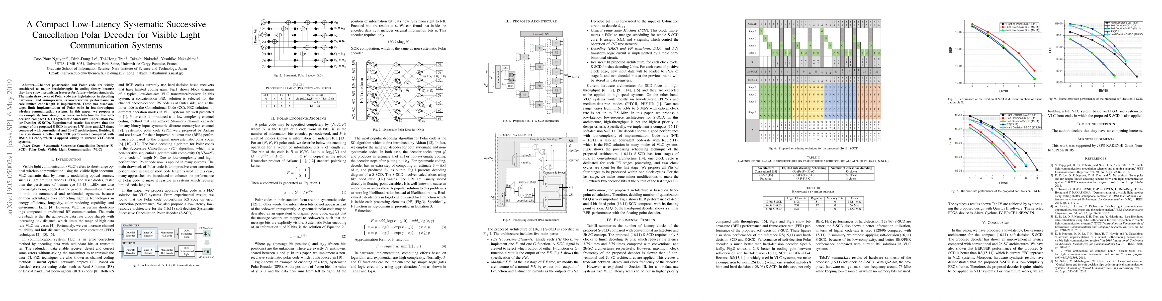 This paper proposes a low-complexity, low-latency hardware architecture for a compact (16,11) Systematic Successive Cancellation Polar Decoder (S-SCD) for visible light communication systems. The proposed decoder significantly reduces latency and improves BER/FER performance compared to conventional and 2b-SC architectures, enhancing the viability of Polar codes in low-throughput systems.